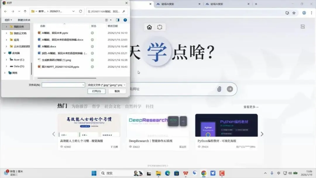 3. 把秘塔保存的课件图片按顺序批量上传(也可以生成后再调整),注意单次最多传30张、不超过20MB,超过的话分多次上传,之后再拼接;