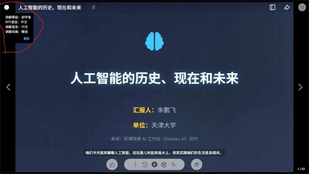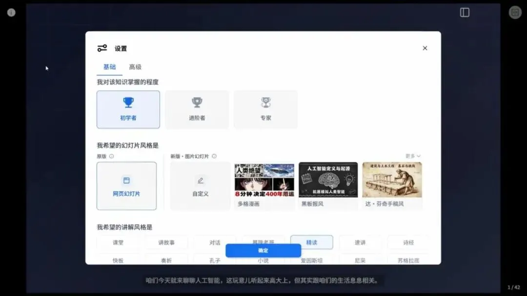 3. 点击【进入课堂】,选择讲解级别,风格,秘塔会自动转写为完整课件。