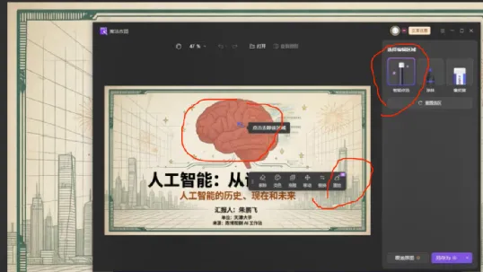 如果生成的课件图片有不满意的地方(比如图片部分不理想、文字错位、想替换素材),用WPS的【AI局部改图】功能调整: