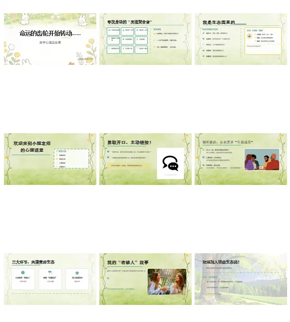 1. 九宫格卡片(每人 1 张,已印刷 9 个匹配维度);2. 空白画纸、彩笔、便利贴(每人 3 张);3. 教室黑板布置 “大自然背景板”(可提前绘制森林、花园等场景);4. 冥想背景音乐(舒缓纯音乐);5. 结尾 PPT(“欢迎来到我们的生态家园,欢迎来到我们的班级”)