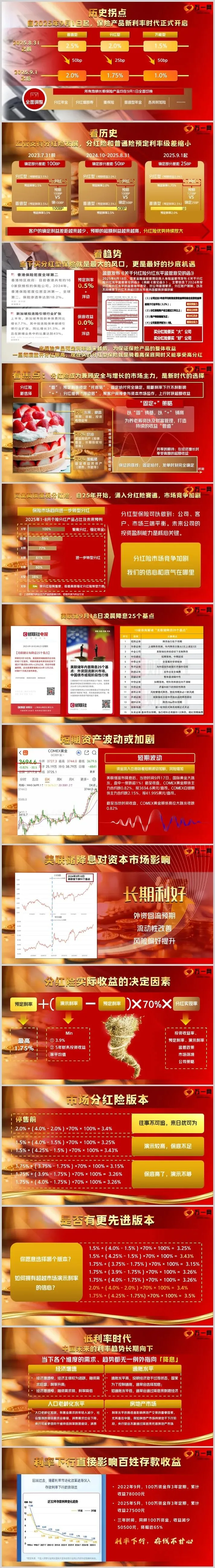 自2025年9月1日起,保险产品的预定利率发生了重大变化。普通型保险产品的预定利率从2.5%下调至2.0%,分红型保险产品的预定利率从2.0%下调至1.75%,而万能型保险产品的预定利率从1.5%下调至1.0%。这一调整意味着保险产品的固定收益部分将减少,但同时也为分红险的发展提供了新的机遇。