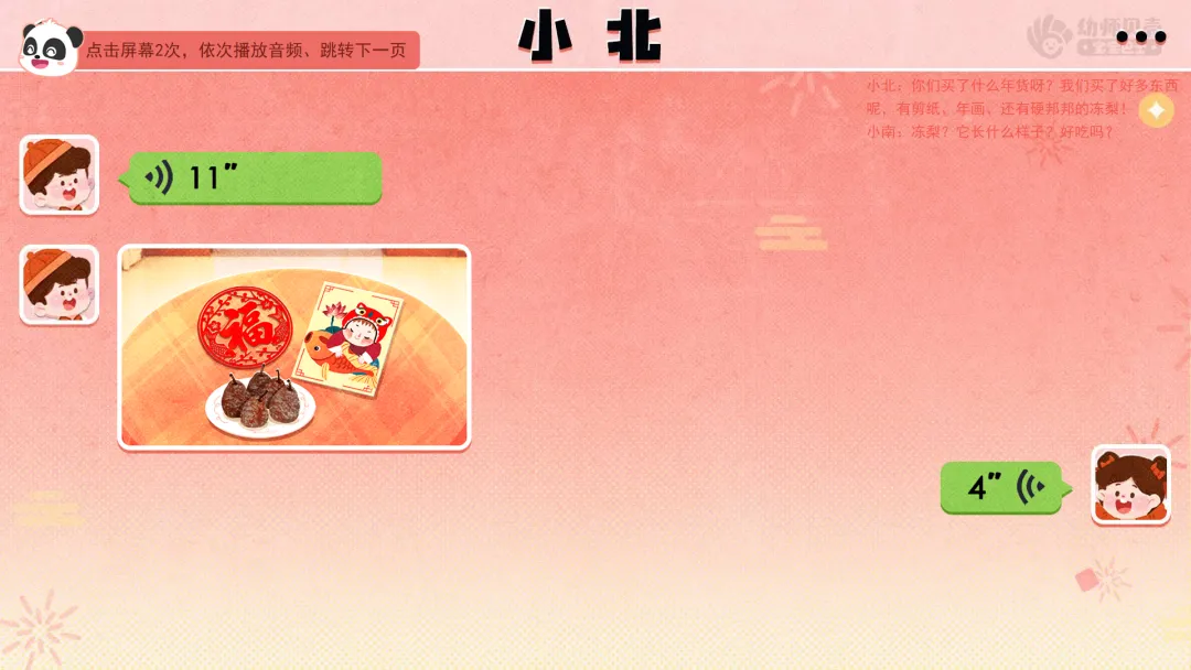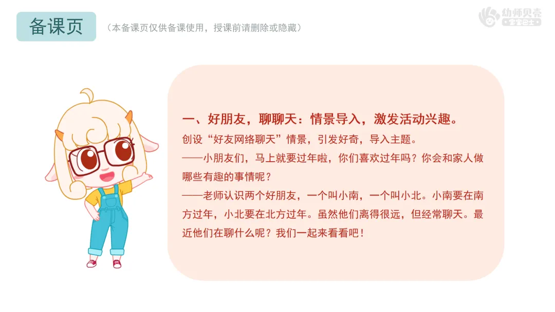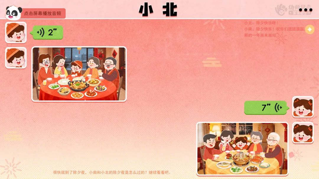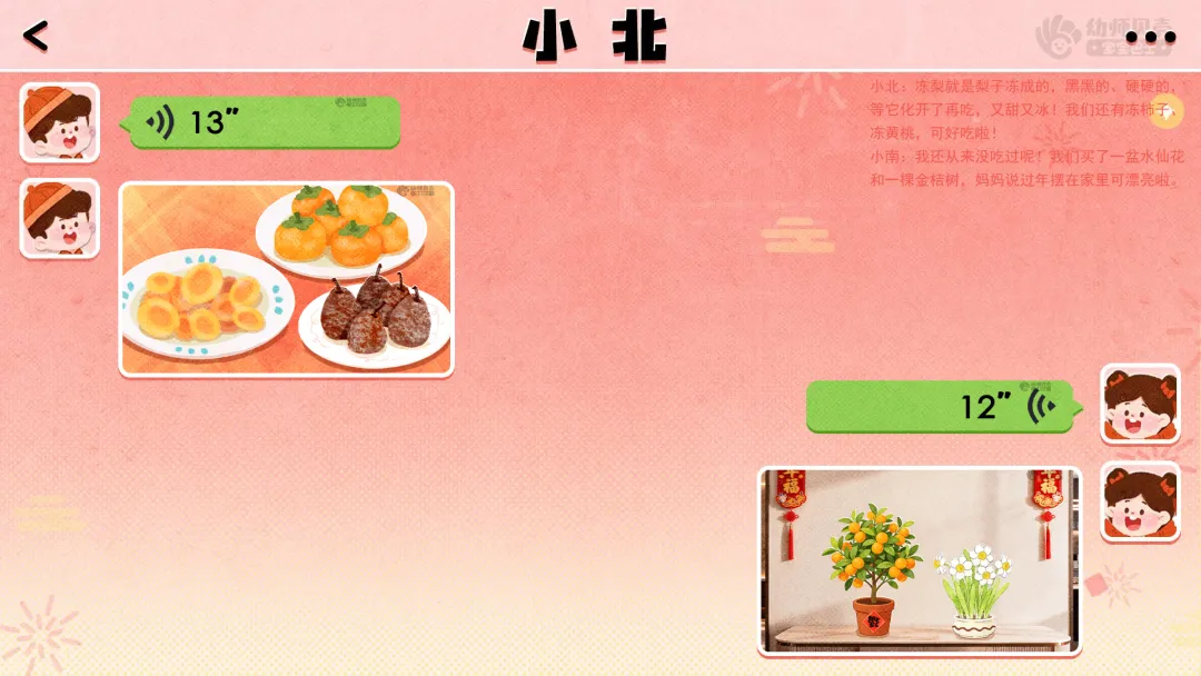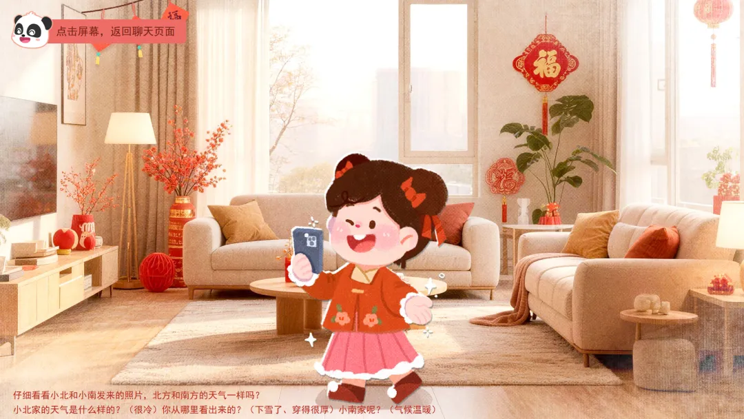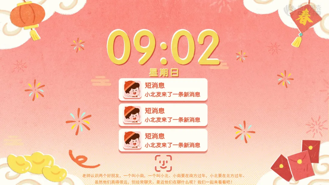 创设“好友网络聊天”情景,引发好奇,导入主题。——小朋友们,马上就要过年啦,你们喜欢过年吗?你会和家人做哪些有趣的事情呢? ——老师认识两个好朋友,一个叫小南,一个叫小北。小南要在南方过年,小北要在北方过年。虽然他们离得很远,但经常用微信聊天。最近他们在聊什么呢?我们一起来看看吧!