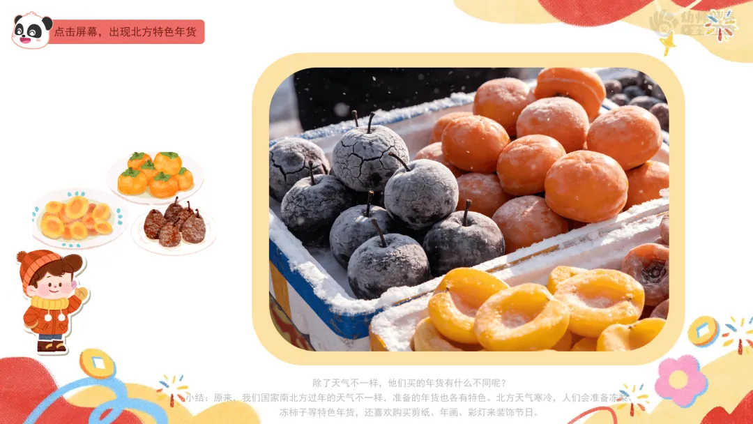 小结:原来,我们国家南北方过年的天气不一样,准备的年货也各有特色。北方天气寒冷,