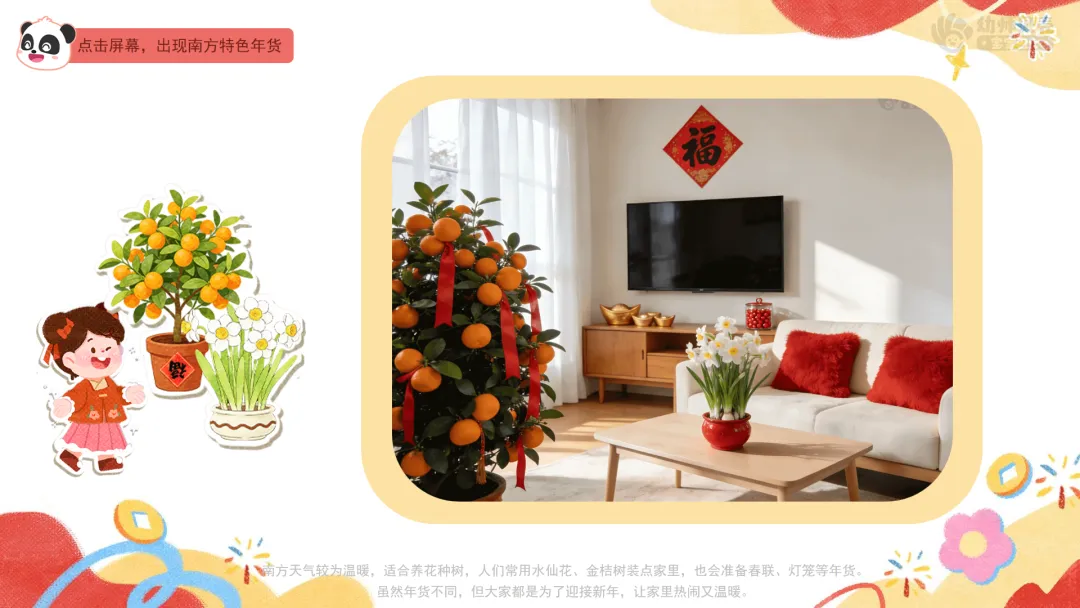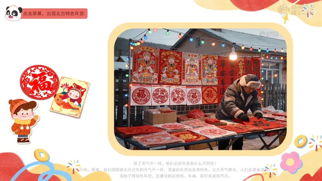 1.感知南北方春节时气候及年货准备的差异。