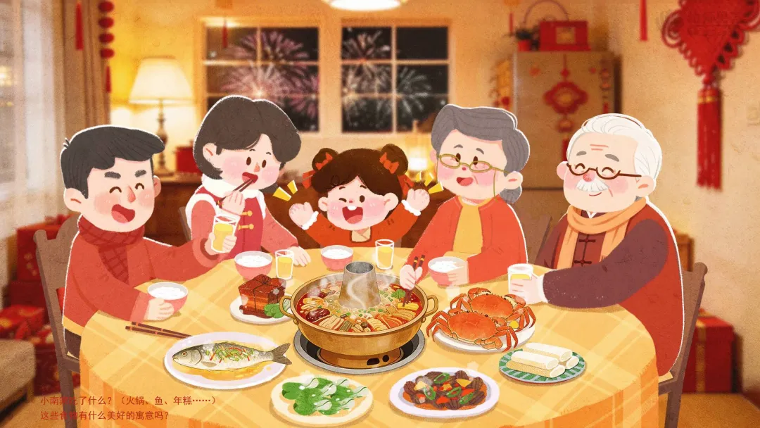 ——小南家吃了什么?(火锅、鱼、年糕……)这些食物有什么美好的寓意吗?