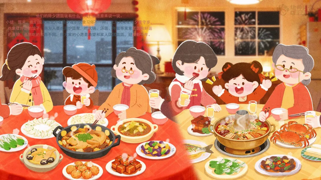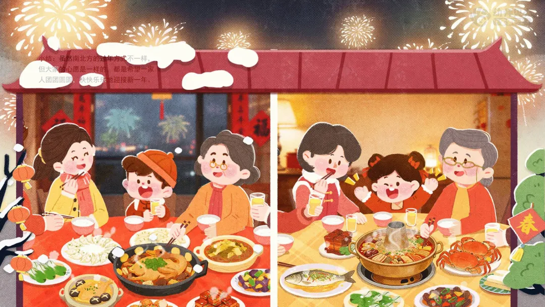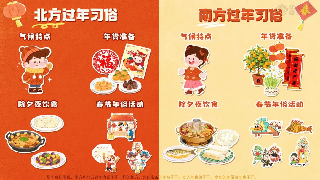 ——刚才我们发现,南方和北方过年有很多不一样的地方,比如准备的年货不同、吃的年夜