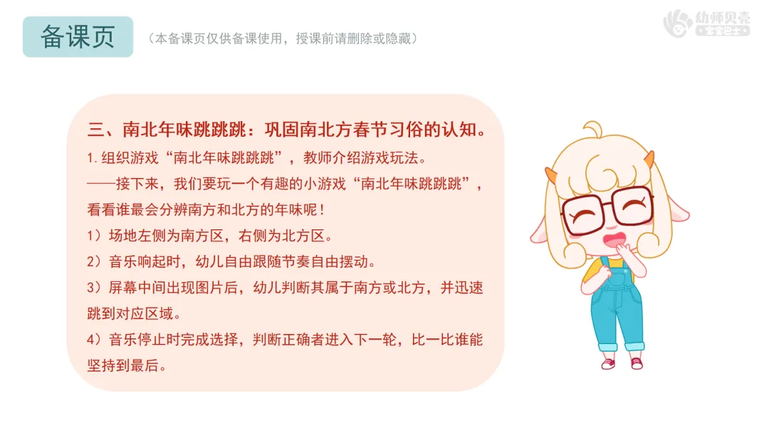1.组织游戏“南北年味跳跳跳”,教师介绍游戏玩法。
