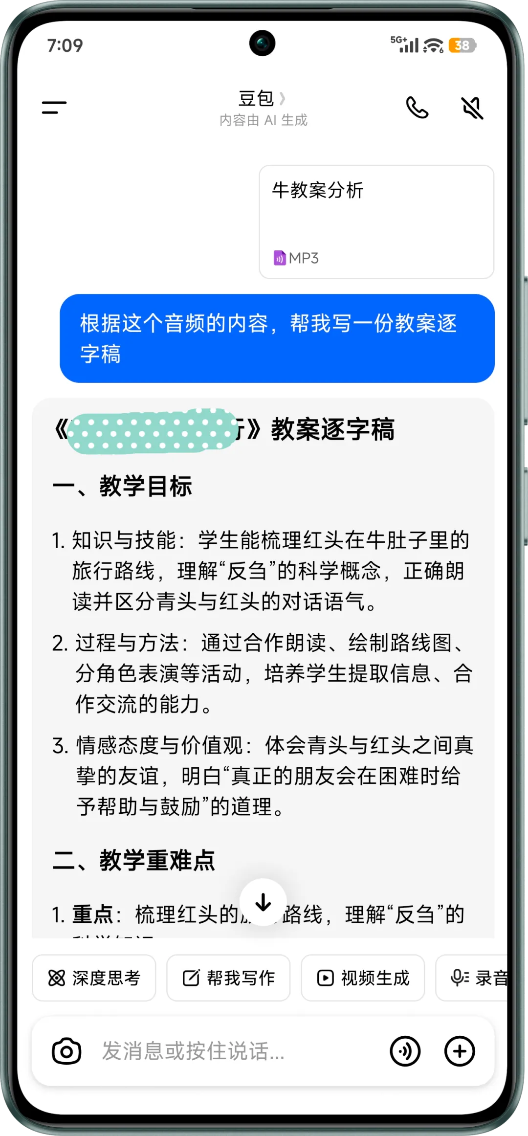 打开任何ai工具,我手机只有豆包,就使用了豆包,然后上传音频文件,写上要求,然后就静待ai把逐字稿输出来。