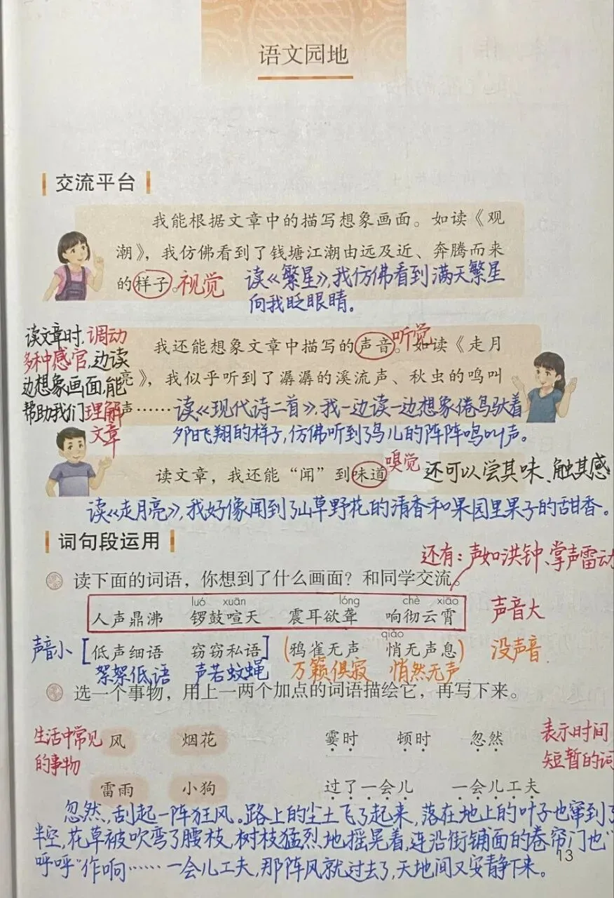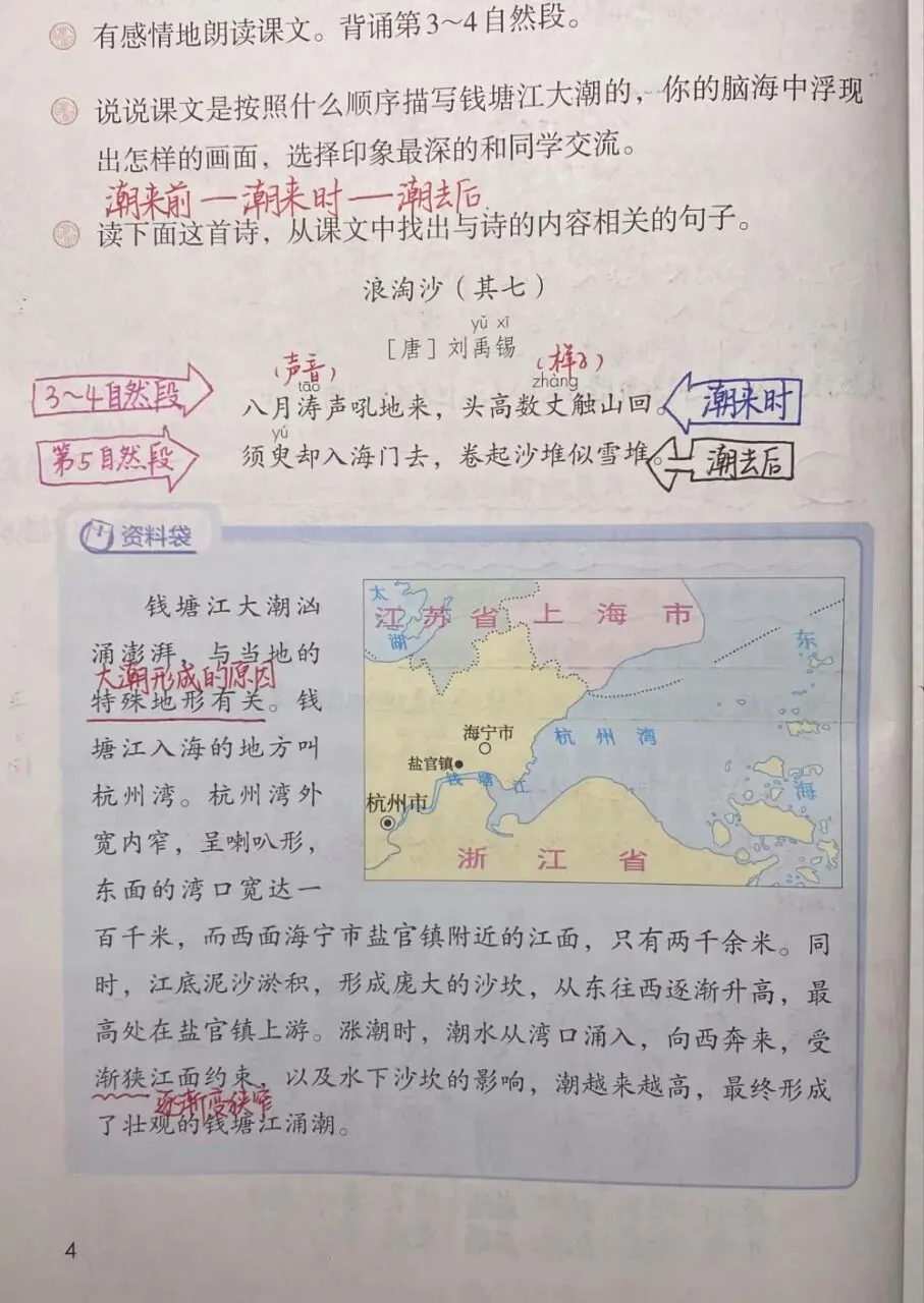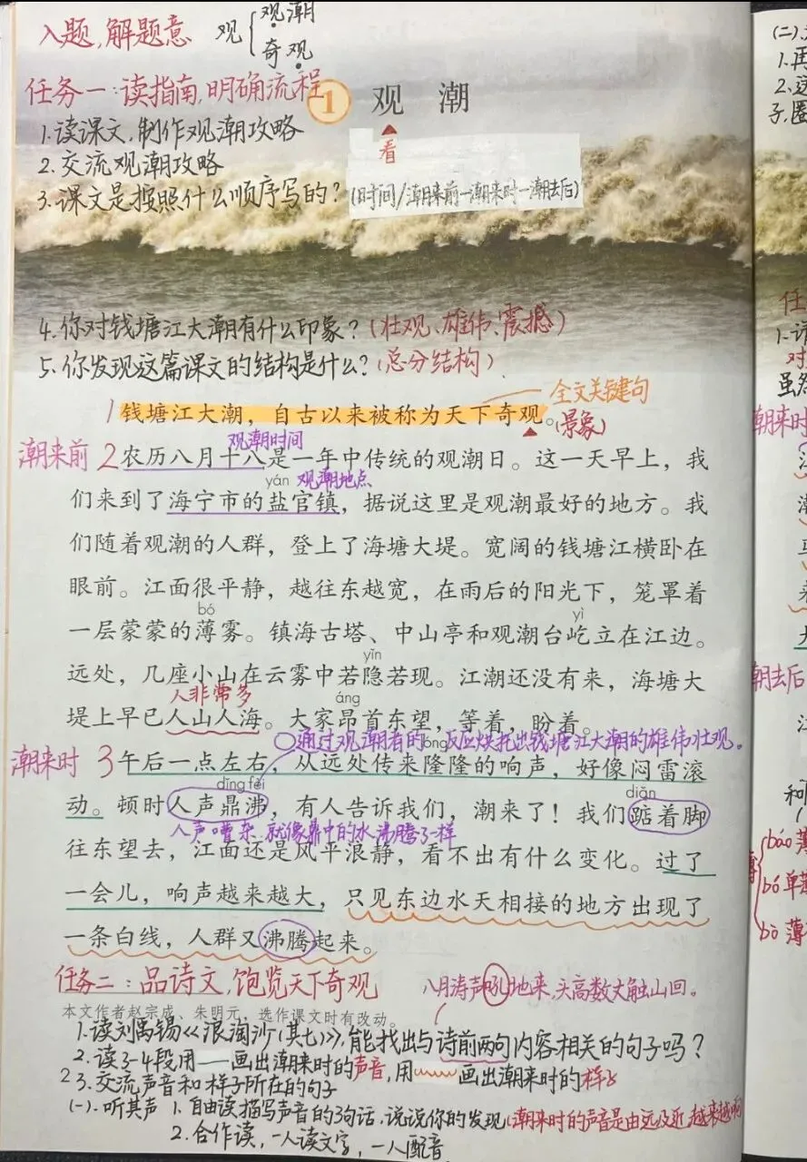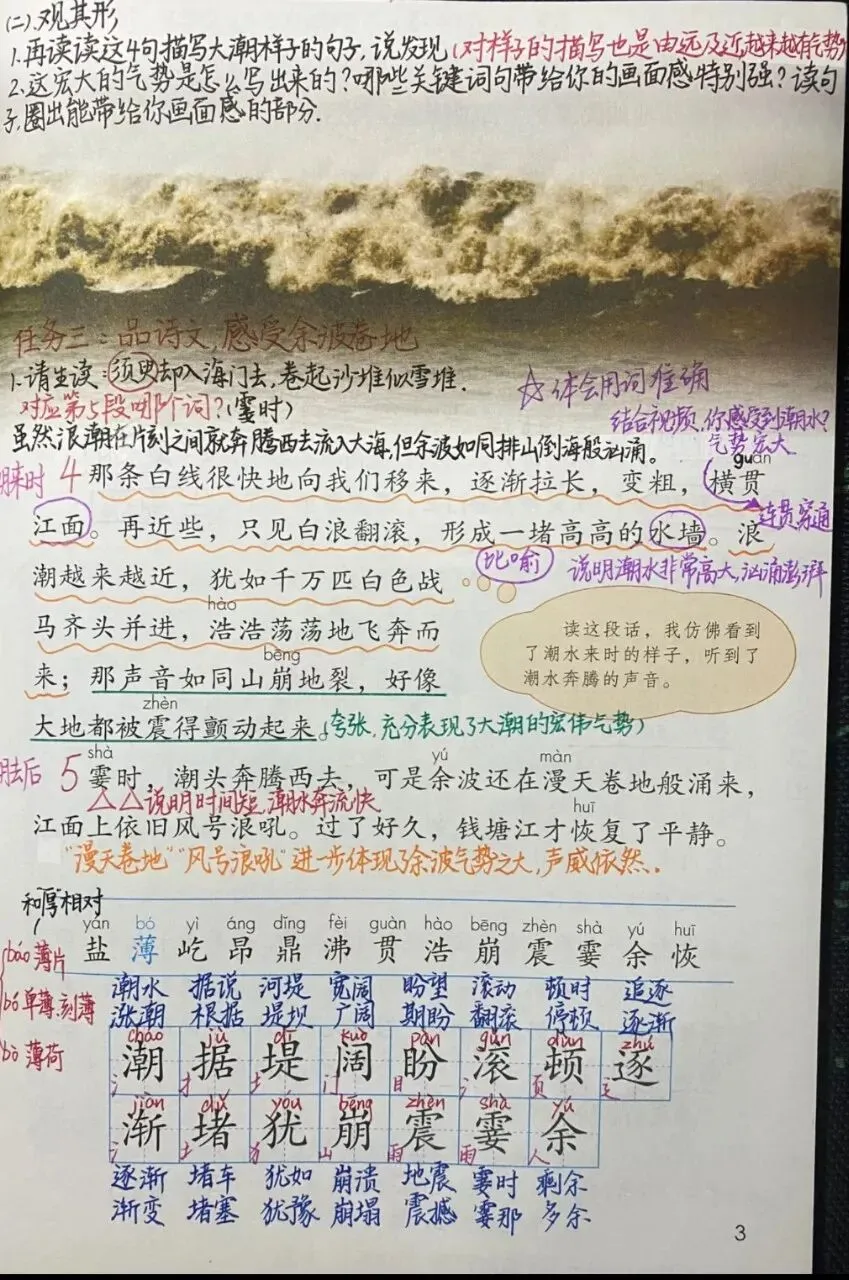 《观潮》 通过想象画面,感受钱塘江潮的特点,不仅可以想象文章中描写的样子,还可以想象描写的声音。