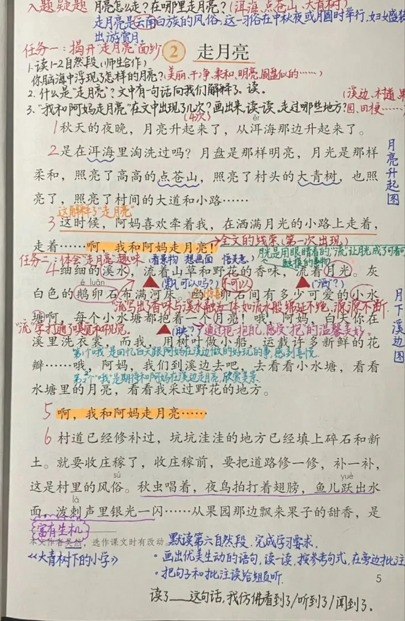 文化自信:引导学生根据语言描写想象画面,感受大自然的神奇之美。大潮的壮观,感受诗情画意的散文《走月亮》,充盈着的快乐、幸福、温馨、甜美之情。