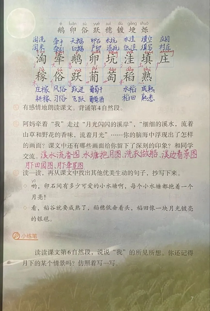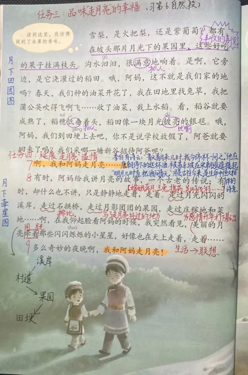《走月亮》 根据文中的语句想象画面,还可以想象文中描写的气味,让画面更丰富。
