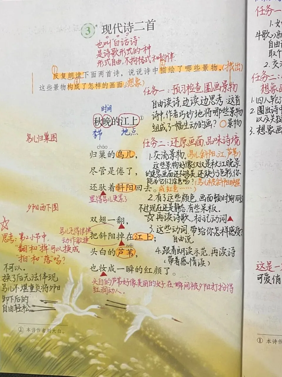 夜景图;现代诗《秋晚的江上》描绘了倦鸟归巢和红霞满天的美景,《花牛歌》描绘了草地里悠然自得的花牛;《繁星》描绘了作者眼中三个不同时期、不同地方的满天繁星。
