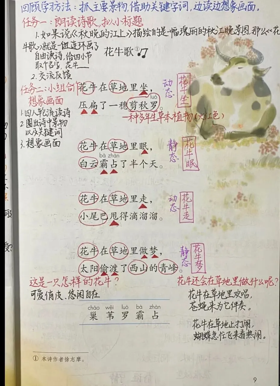 语言运用:通过阅读,感受《现代诗二首》中晚秋的美和小花牛的可爱。充满童真、童趣的《繁星》表现了作者对美好生活的向往之情。引导学生了解景物引发的联想和不同感受。