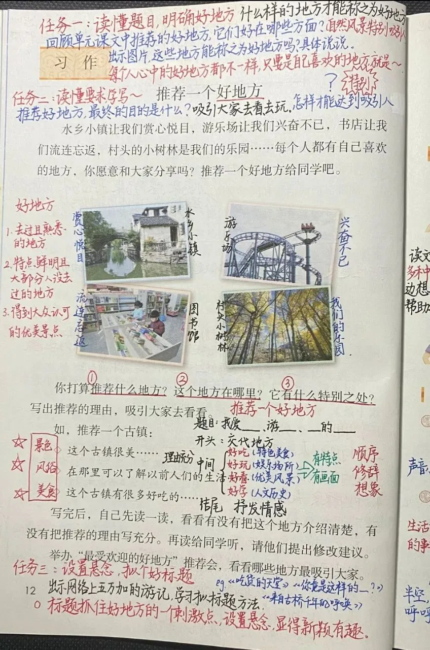 本单元的习作要求是“推荐一个好地方,写清楚推荐理由”。教材以分享和推荐的方式,让学生介绍自己喜欢的好地方,旨在激发学生的习作兴趣,让他们从本单元“自然之美”的学习走向生活实际,表达对美好生活的真切感受。