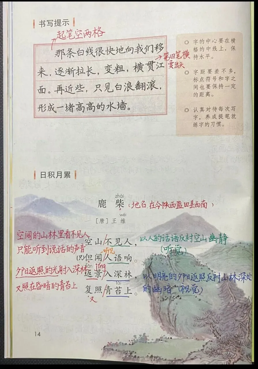 本单元以“自然之美”为主题,编排了《观潮》《走月亮》《现代诗二首》《繁星》四篇课文。《观潮》写钱塘潮这一“天下奇观”,在潮来潮去中展现了一幅幅雄起多姿的画卷;《走月亮》写“我”和阿妈在秋夜月光下散步的所见所想,展现出一幅幅乡村静谧、清幽的