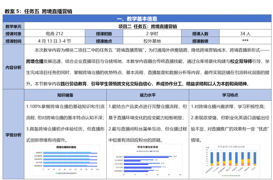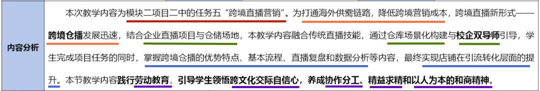 案例的内容分析就比较简洁,主要说明了本次课的教学内容在整个教学体系中的位置(模块二项目二任务五)、本节课内容的学习背景(打通链路、降低成本,发展迅速)、本节课的主要项目资源(企业直播项目与仓储场地、校企双导师)、本节课的主要内容(跨境仓播优势特点、基本流程、直播复盘、数据分析,店铺引流转化提升)、本节课主要融入的思政元素(劳动教育、跨文化交际自信、协作分工、精益求精、以人为本和商精神)等。