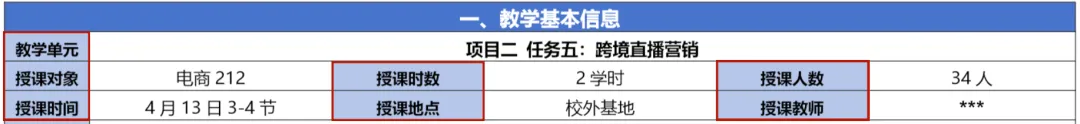 这一部分主要是写明本次课堂教学的课程名称、授课学时、授课地点、专业名称、授课对象、授课人数等基础信息,只要填写的内容与课程标准一致,不暴露参赛团队的真实信息即可。
