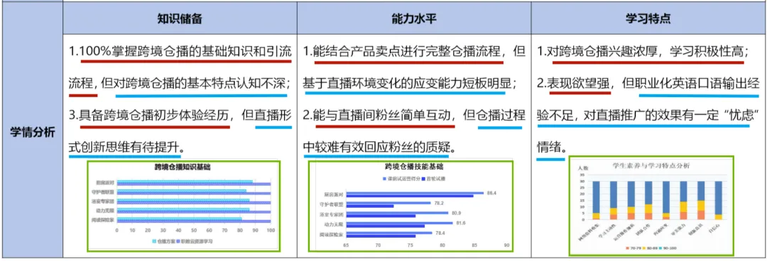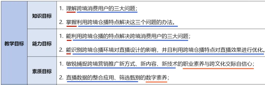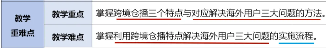 案例的教学重点就是从知识目标和能力目标中进行提炼得出的,“掌握跨境仓播三个特点”对应知识目标的“掌握利用跨境仓播特点”。“对应解决海外用户三大问题的方法”则与能力目标的“能力有跨境仓播的特点解决跨境消费用户的三大问题”相对应。