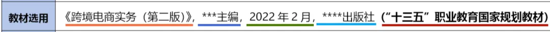 案例的教材选用就是用加粗的字体说明了本节课所用的教材为“十三五”规划教材《跨境电商实务(第二版)》,并说明该教材的主编、出版时间、出版社等信息,大家可以参考一下这个写法。