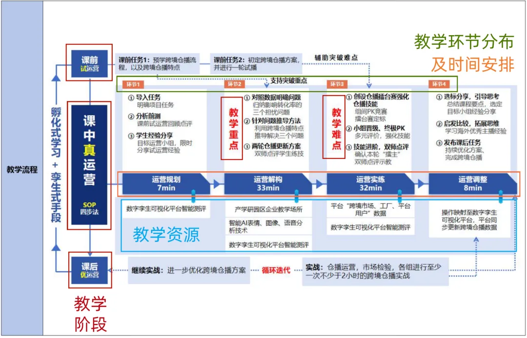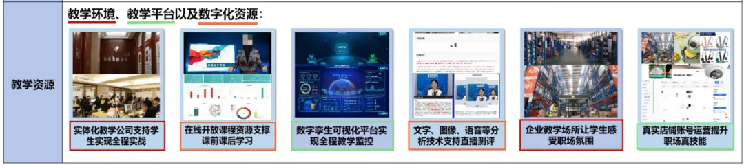 案例的教学资源就是从教学环境(实体化教学公司、企业教学场所)、教学平台(数字孪生可视化平台、真实店铺账号)、数字化资源(在线开放课程资源、文字图像语音分析技术)三个方面来展示本节课主要用到的教学资源,先放教学资源的图片,后放文字说明该资源对开展教学的具体作用,整体排版舒适直观,非常值得我们借鉴学习。
