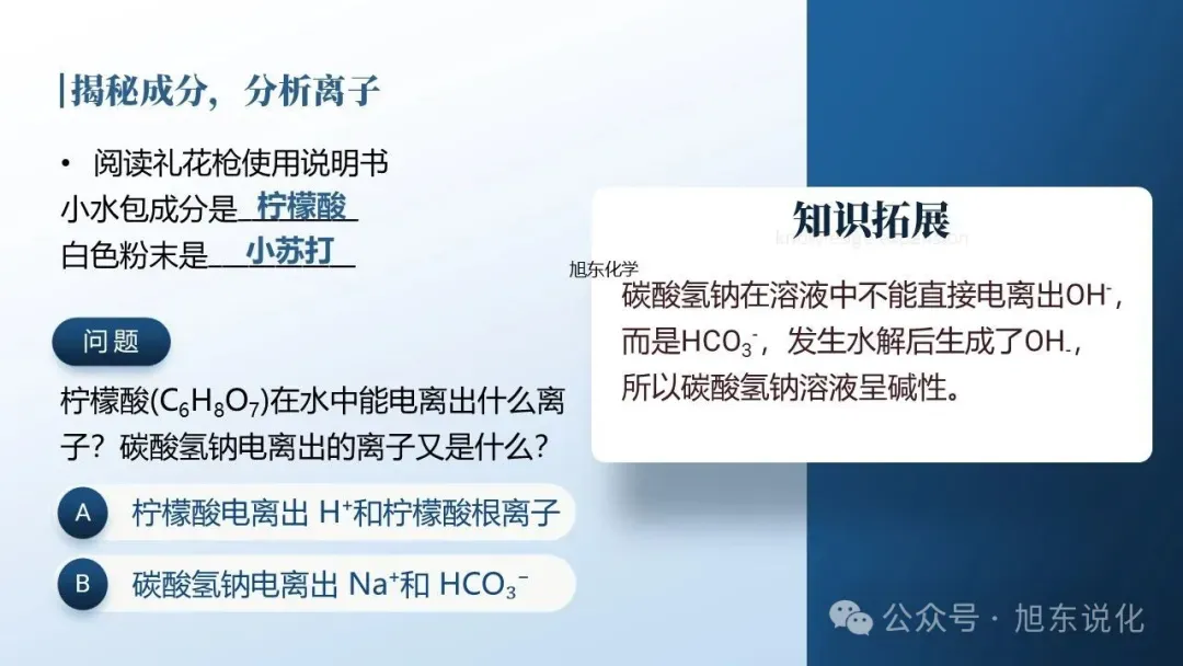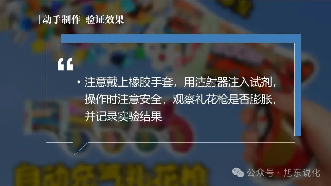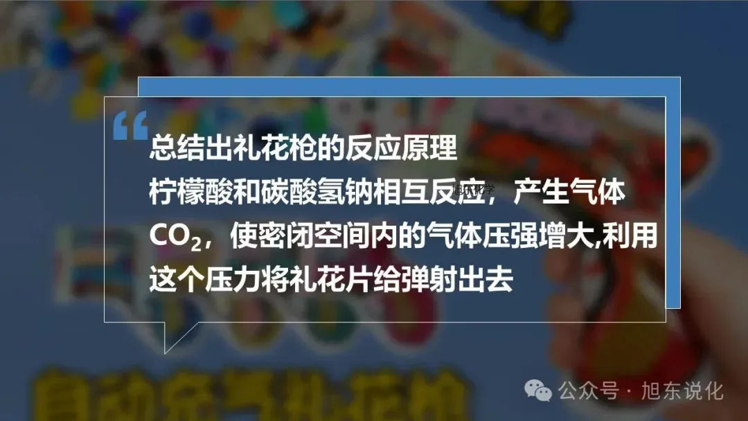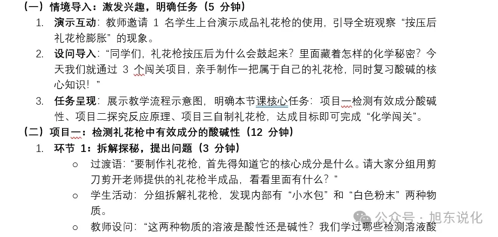 采用项目式教学方式,以"自制礼花枪"为任务驱动,通过检测礼花枪中有效成分的酸碱性、探究礼花枪反应原理、制作礼花枪三个子项目,帮助学生达成学习目标。