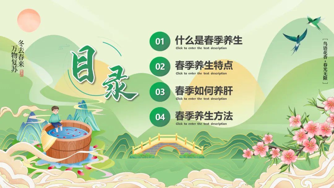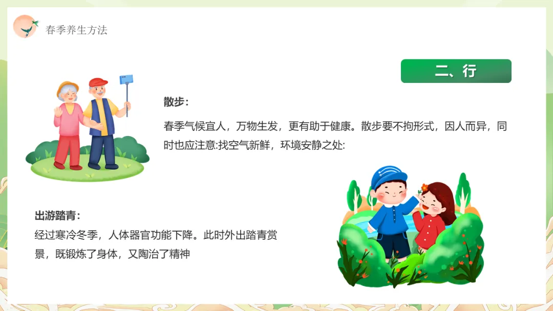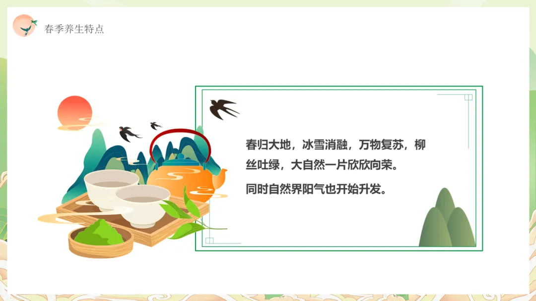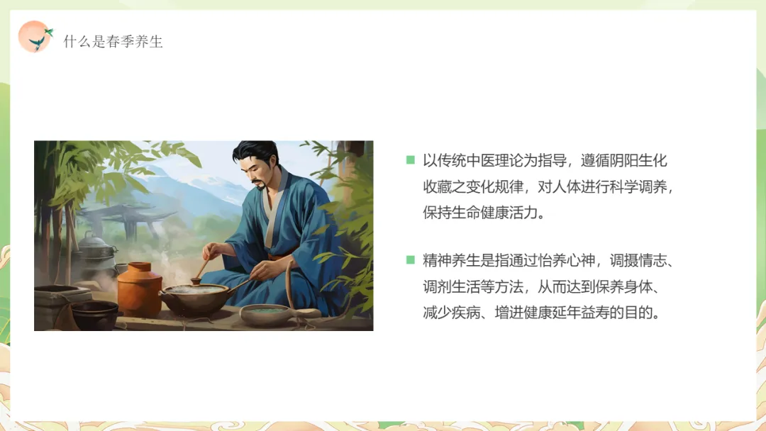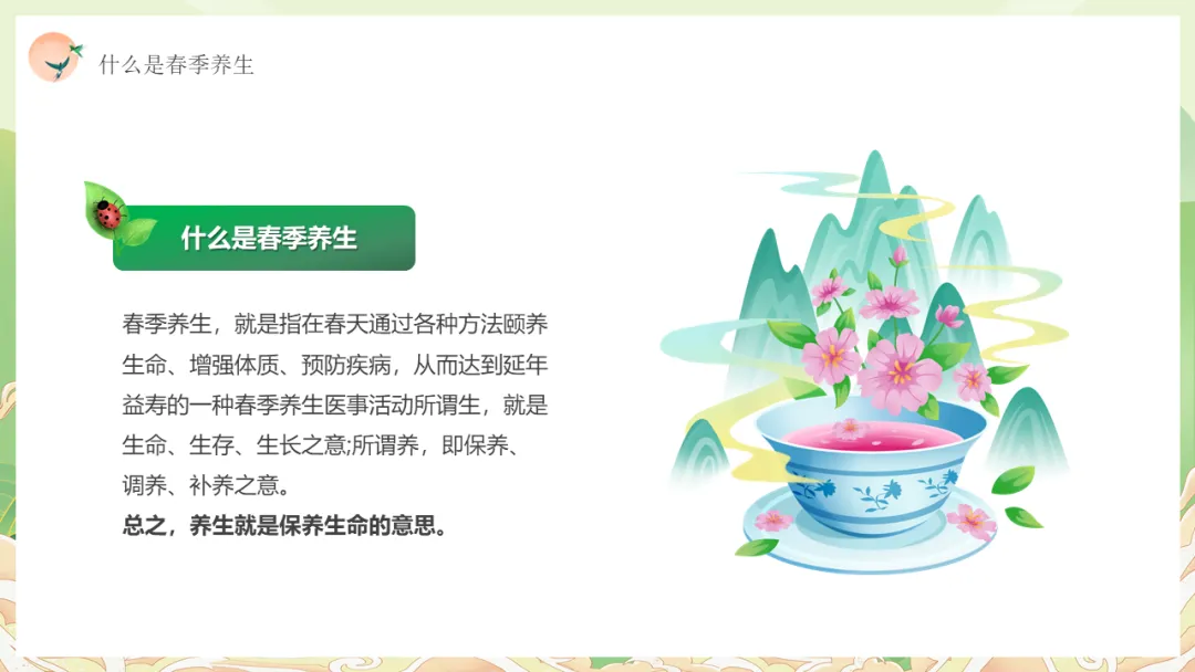 春季养生,就是指在春天通过各种方法颐养生命、增强体质、预防疾病,从而达到延年益寿的一种春季养生医事活动所谓生,就是生命、生存、生长之意;所谓养,即保养、调养、补养之意。
