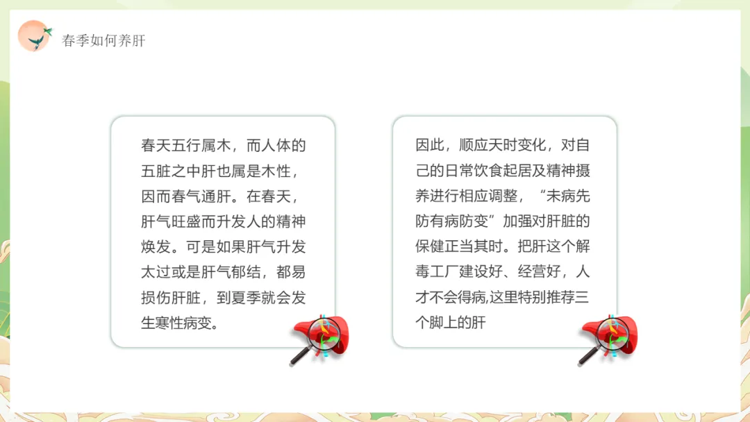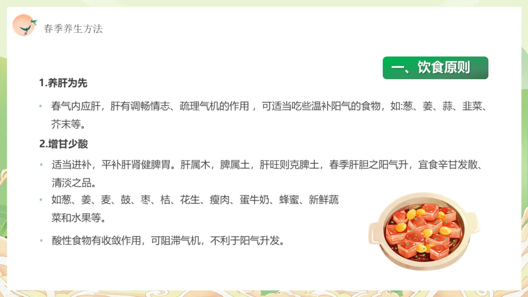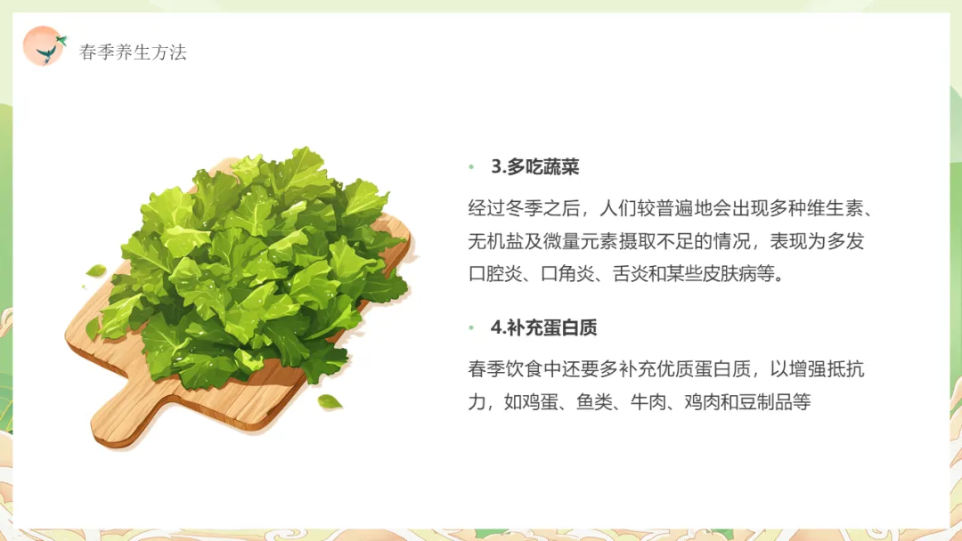 适当进补,平补肝肾健脾胃。肝属木,脾属土,肝旺则克脾土,春季肝胆之阳气升,宜食辛甘发散、清淡之品。