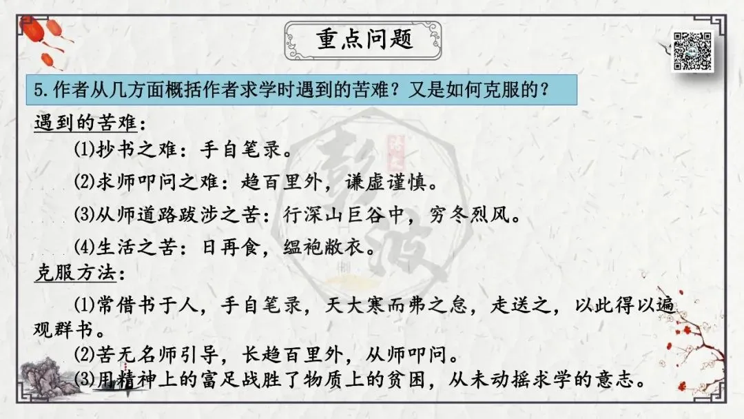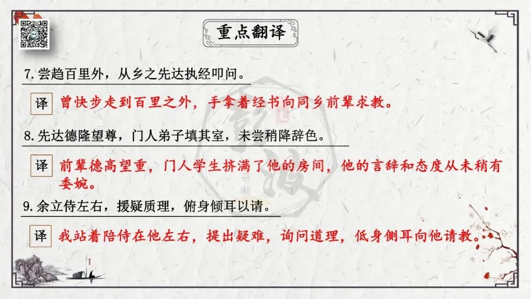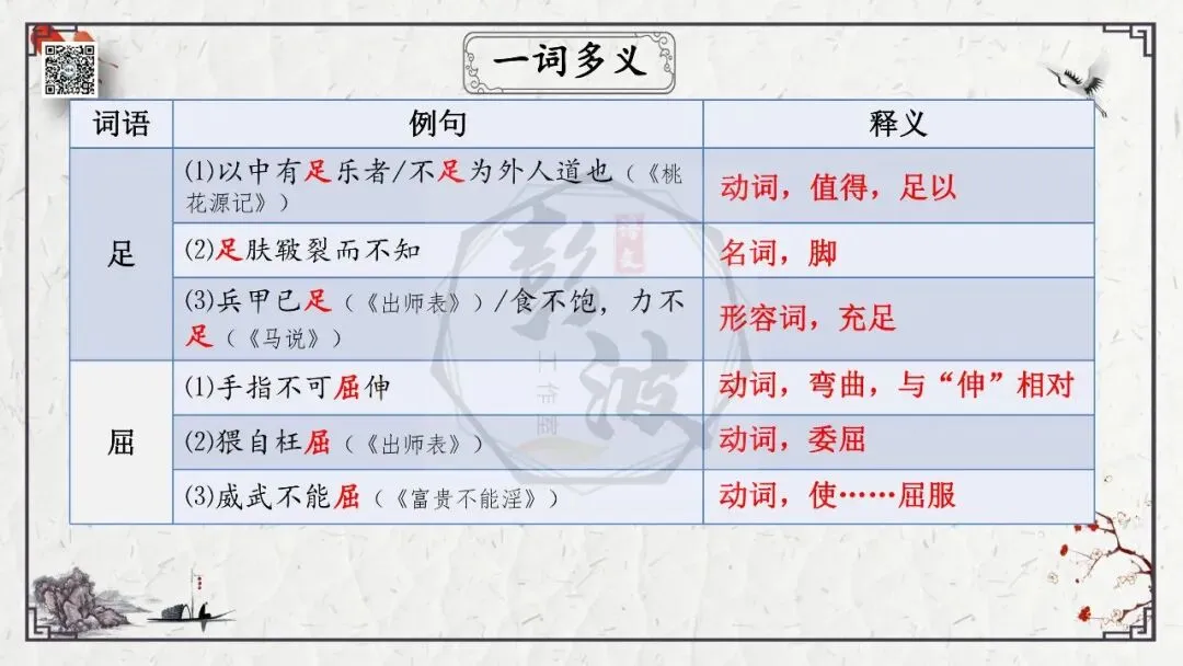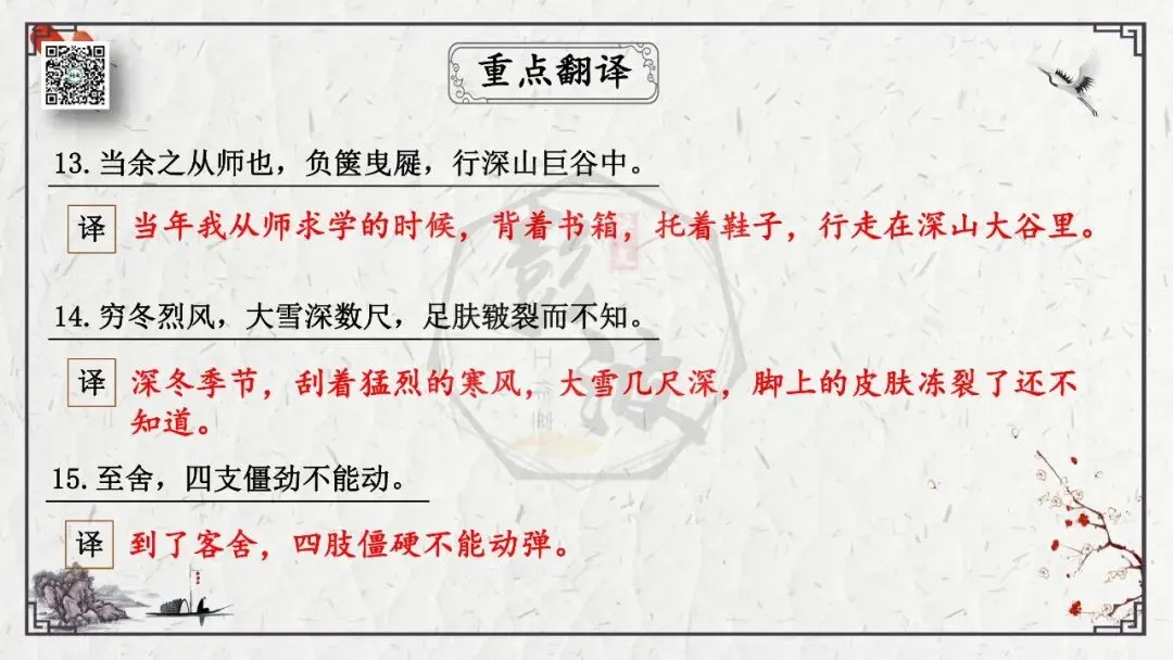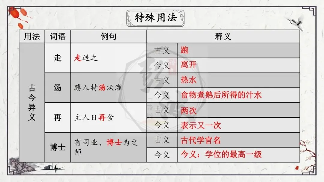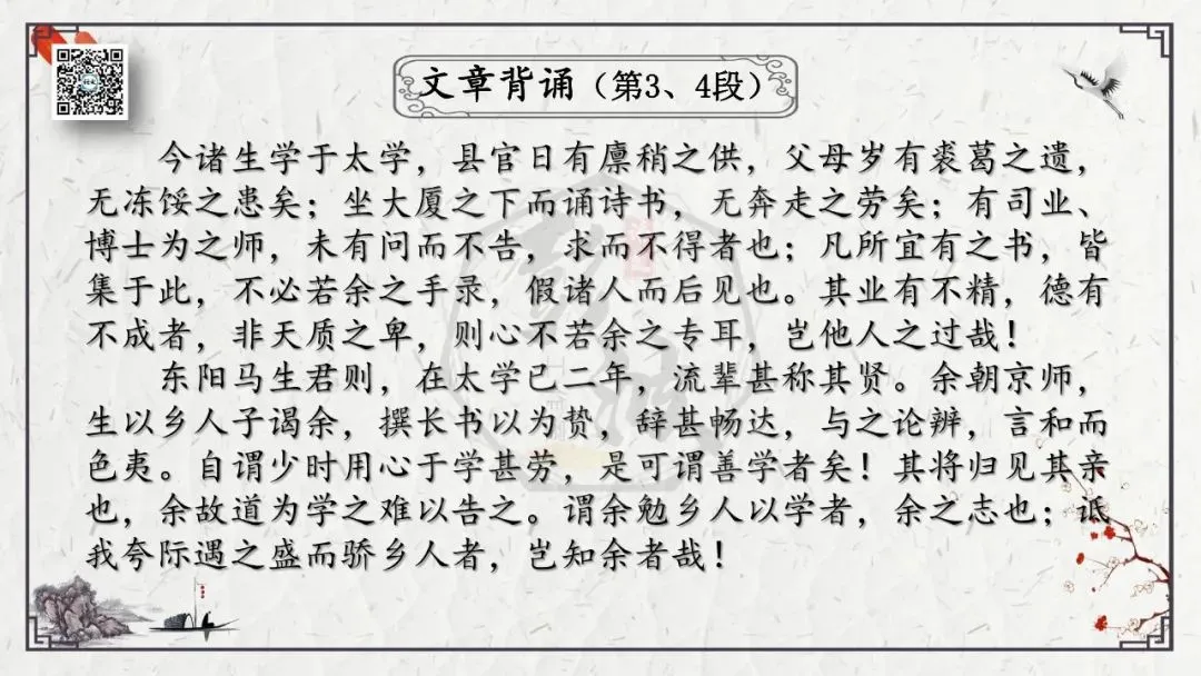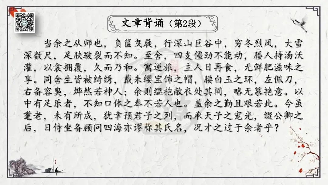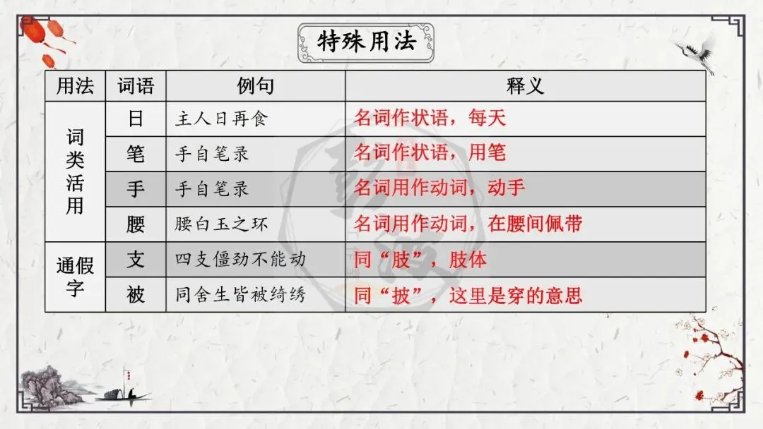 4.除此之外,课标中“随文学习基本的词汇、语法知识,用来帮助理解课文中的语言难点;了解常用的修辞方法,体会它们在课文中的表达效果”,即要求在随文学习中要掌握文言文实词、虚词、语法、修辞、句子翻译、文意理解、语言赏析等知识点。