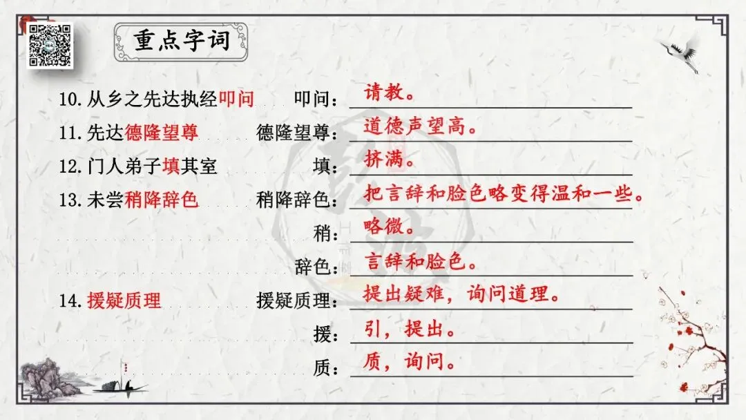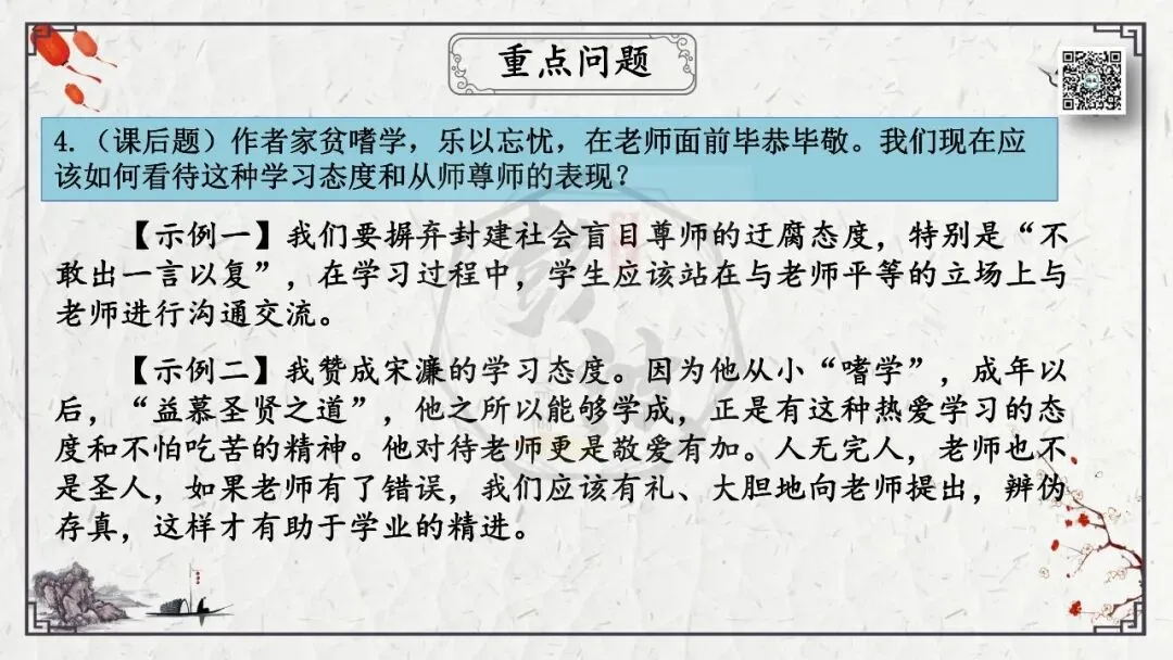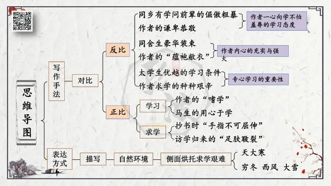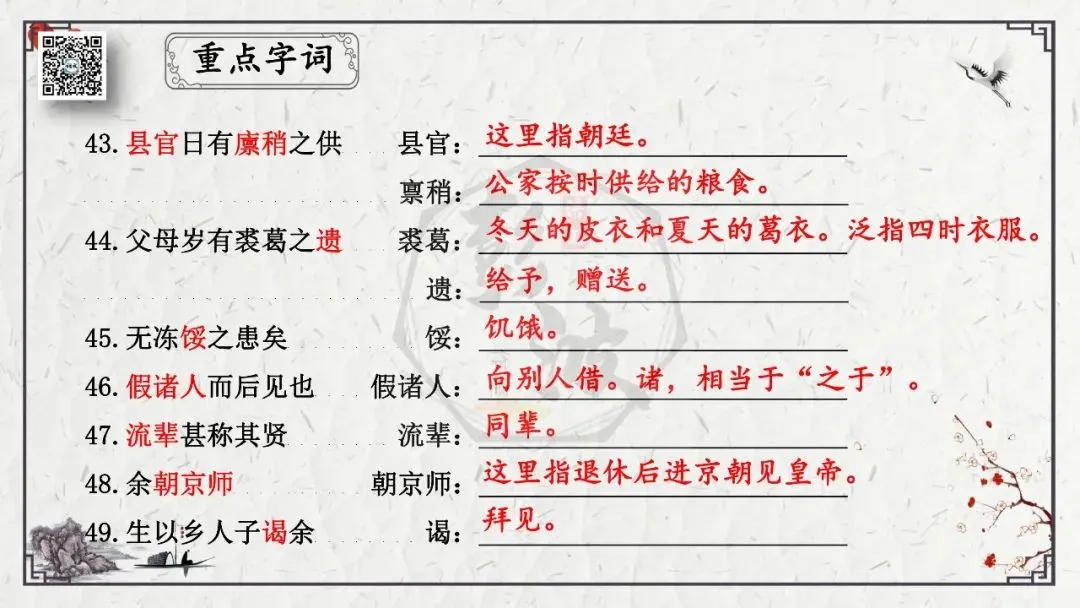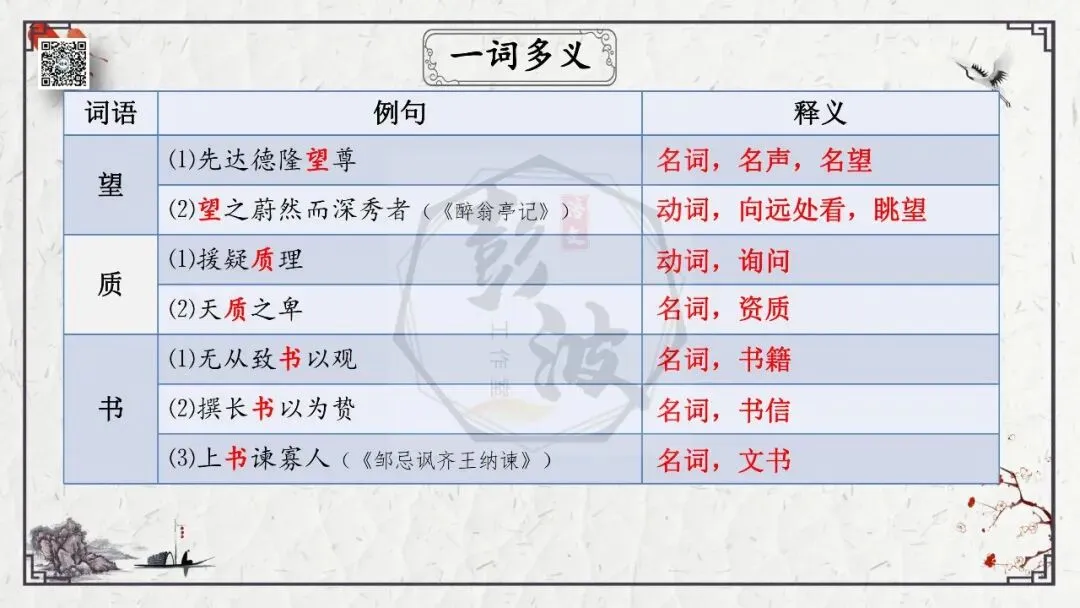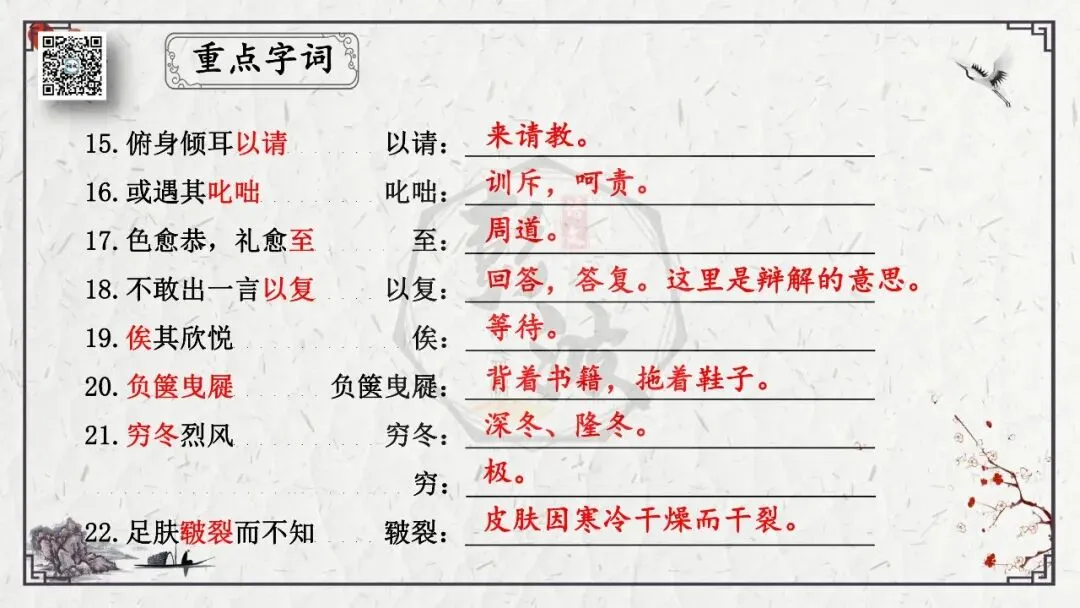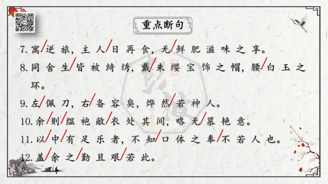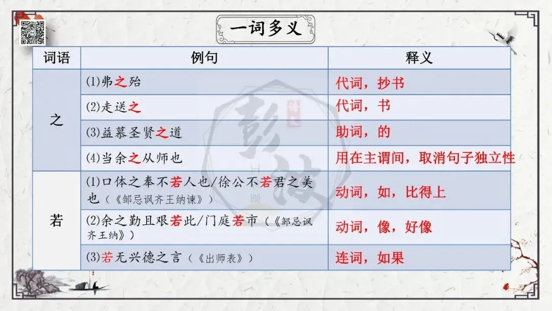 4.除此之外,课标中“随文学习基本的词汇、语法知识,用来帮助理解课文中的语言难点;了解常用的修辞方法,体会它们在课文中的表达效果”,即要求在随文学习中要掌握文言文实词、虚词、语法、修辞、句子翻译、文意理解、语言赏析等知识点。