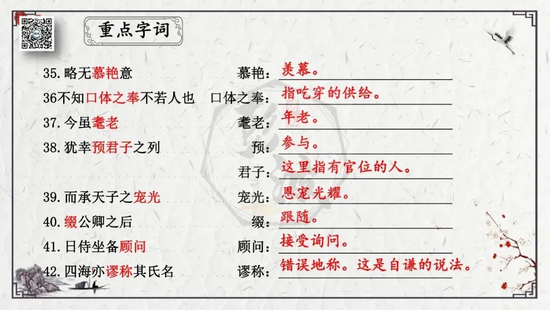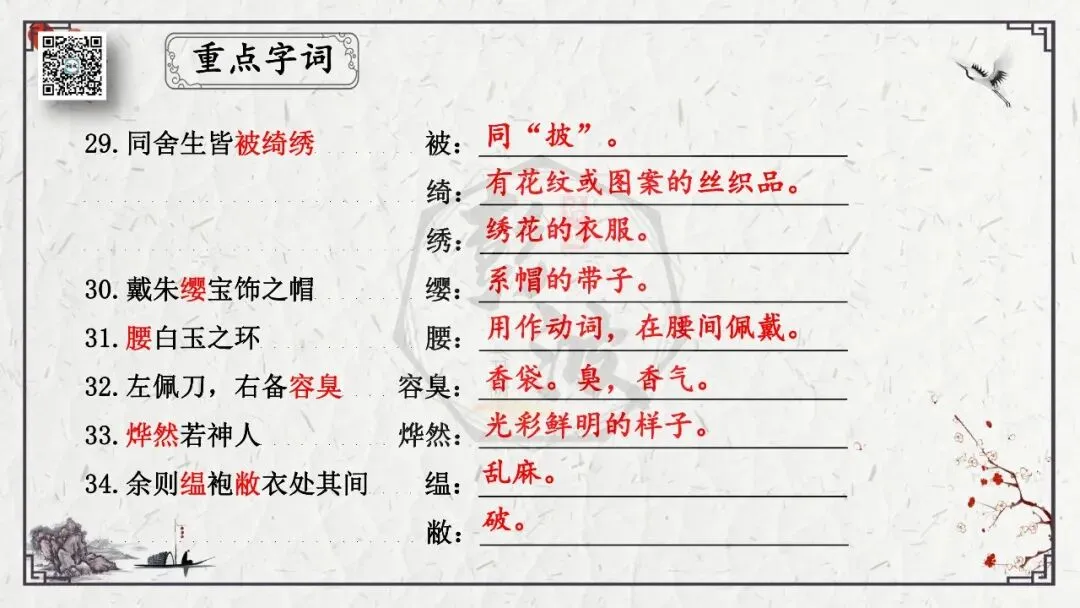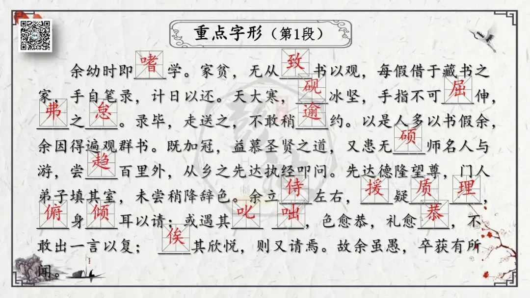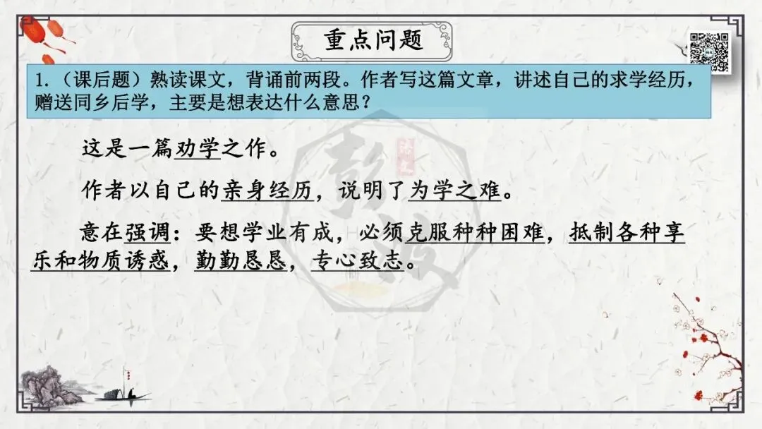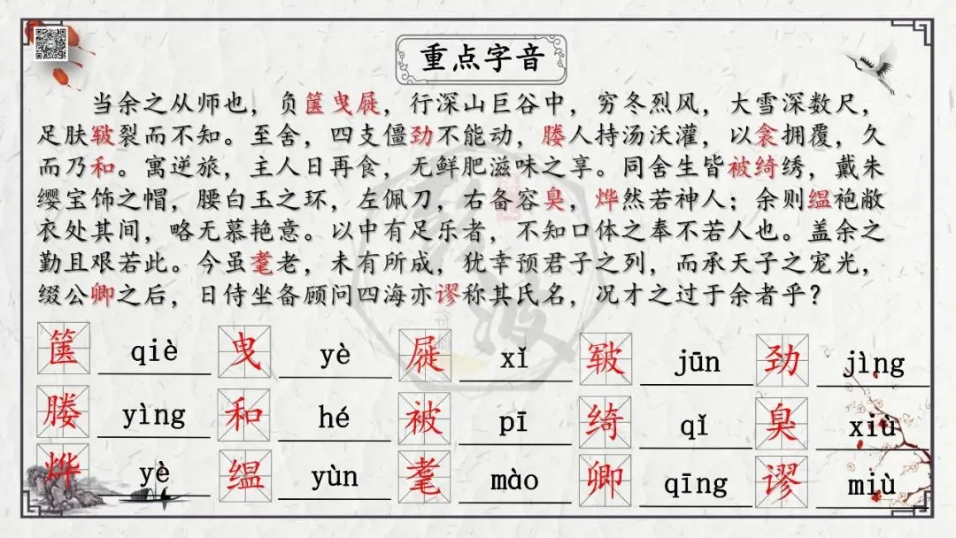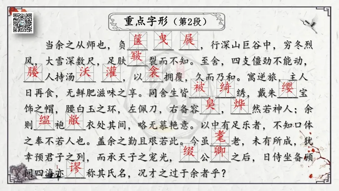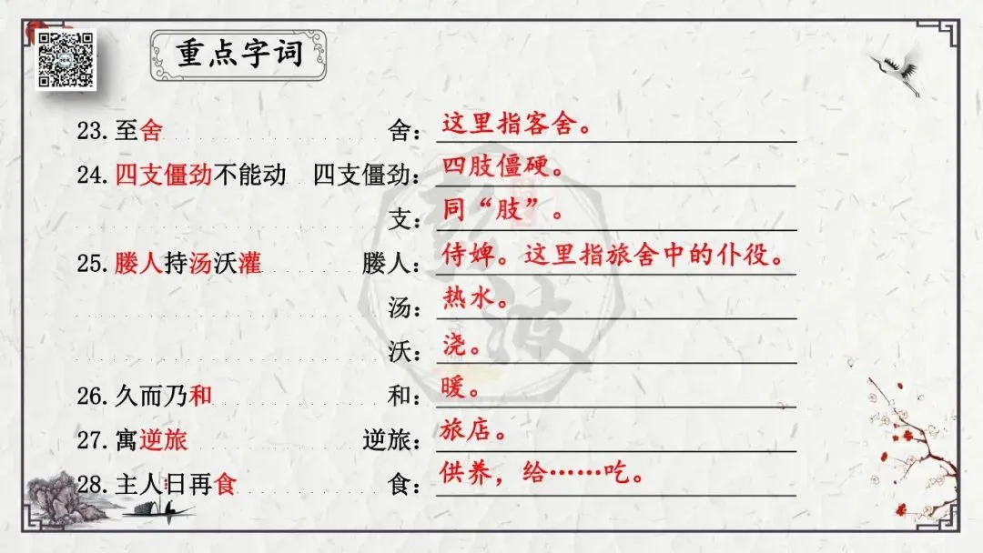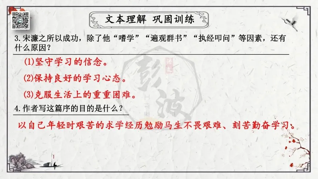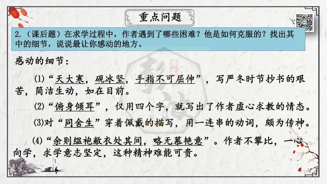 4.除此之外,课标中“随文学习基本的词汇、语法知识,用来帮助理解课文中的语言难点;了解常用的修辞方法,体会它们在课文中的表达效果”,即要求在随文学习中要掌握文言文实词、虚词、语法、修辞、句子翻译、文意理解、语言赏析等知识点。