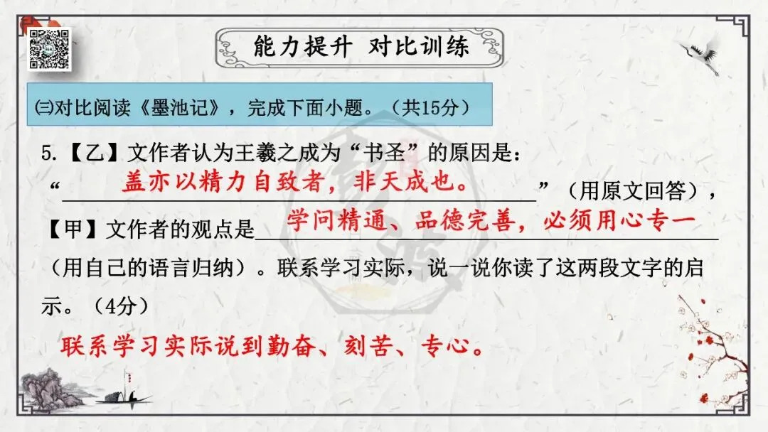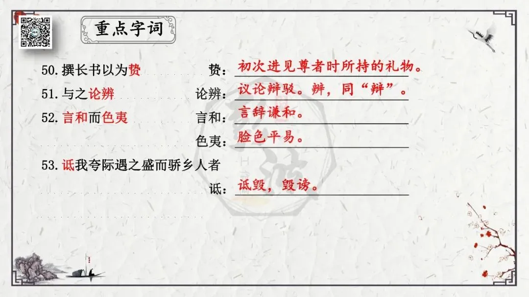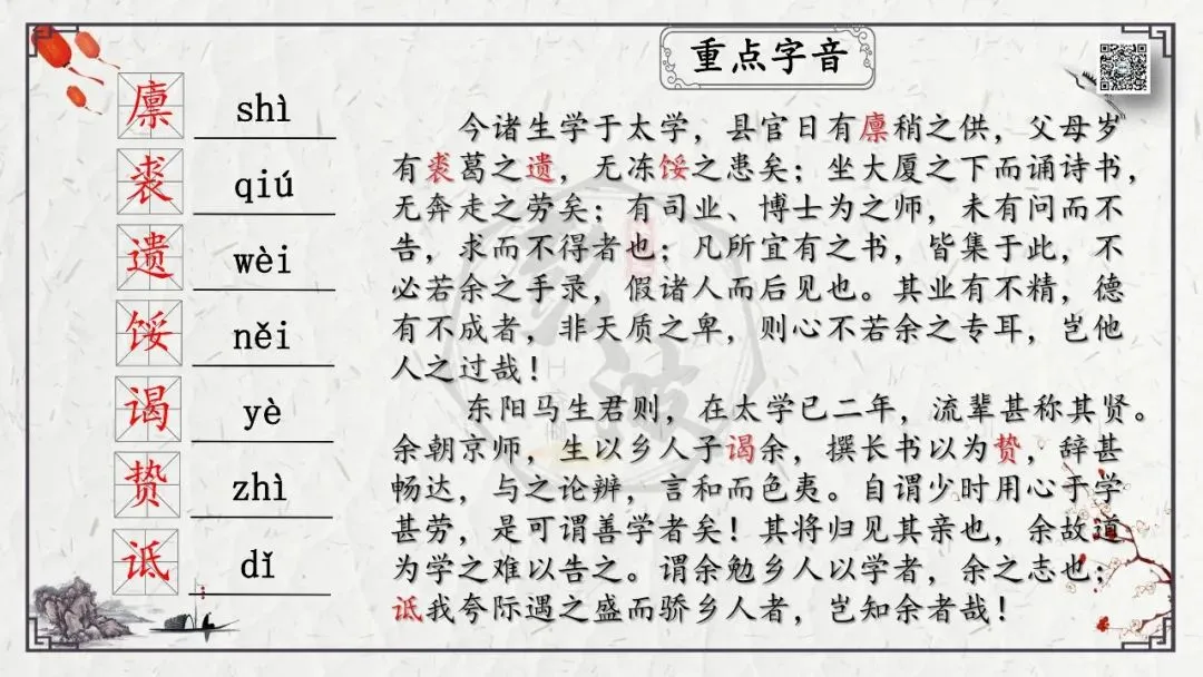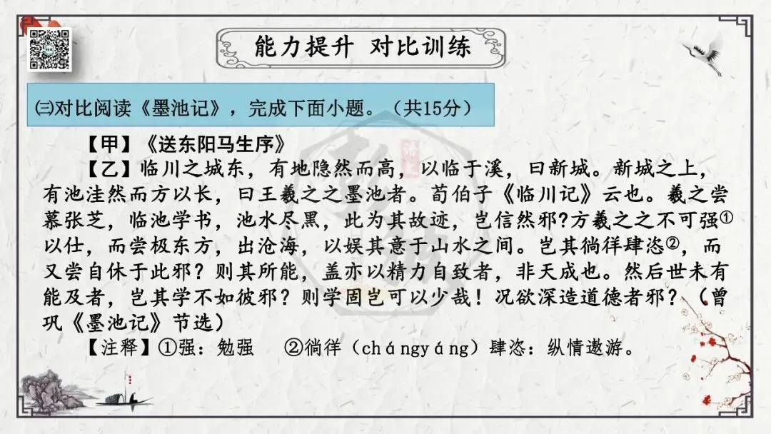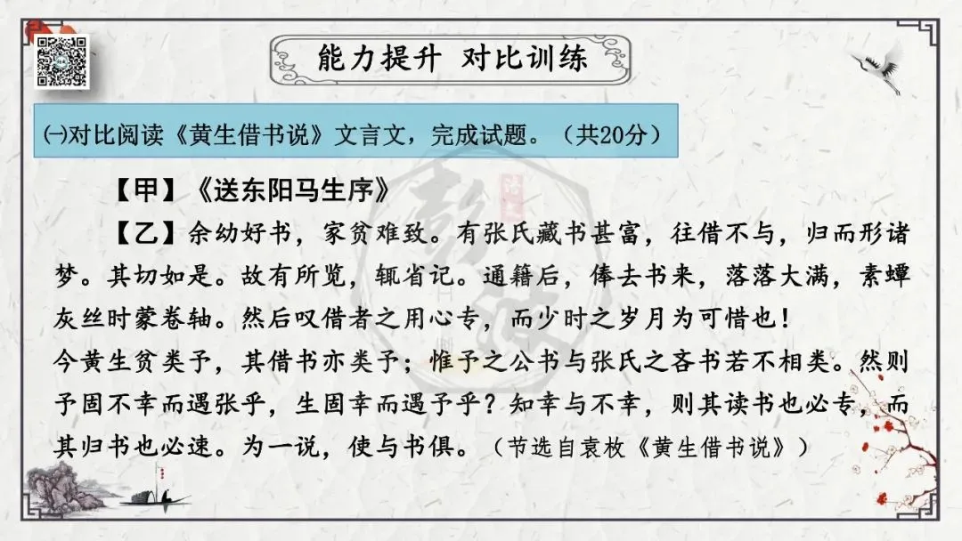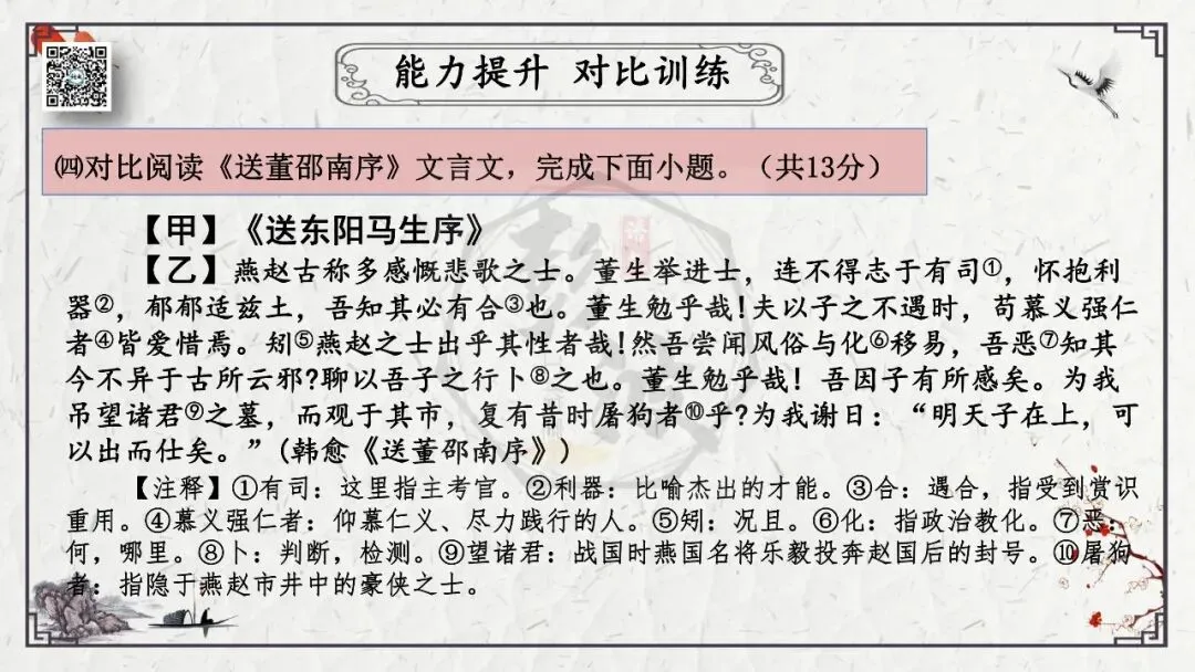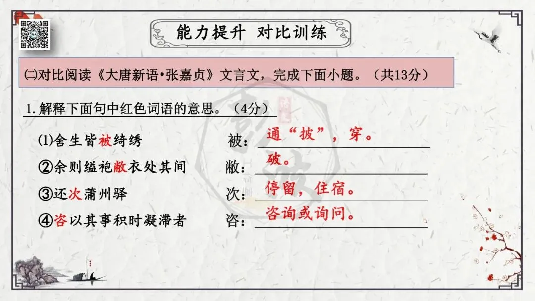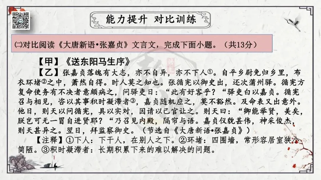 对应考点:①理解常见文言实词在具体语境中的含义。②理解常见文言虚词在具体语境中的意义和用法。③理解并翻译句子。④断句。⑤理解文章的基本内容,分析归纳文章内容要点。⑥分析概括文章所表达的作者的观点或态度。⑦对文章的内容、语言、写法有自己的体会和见解。⑧分析探究链接材料。
