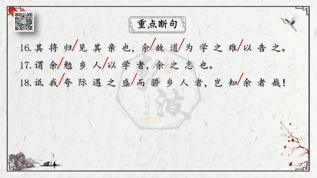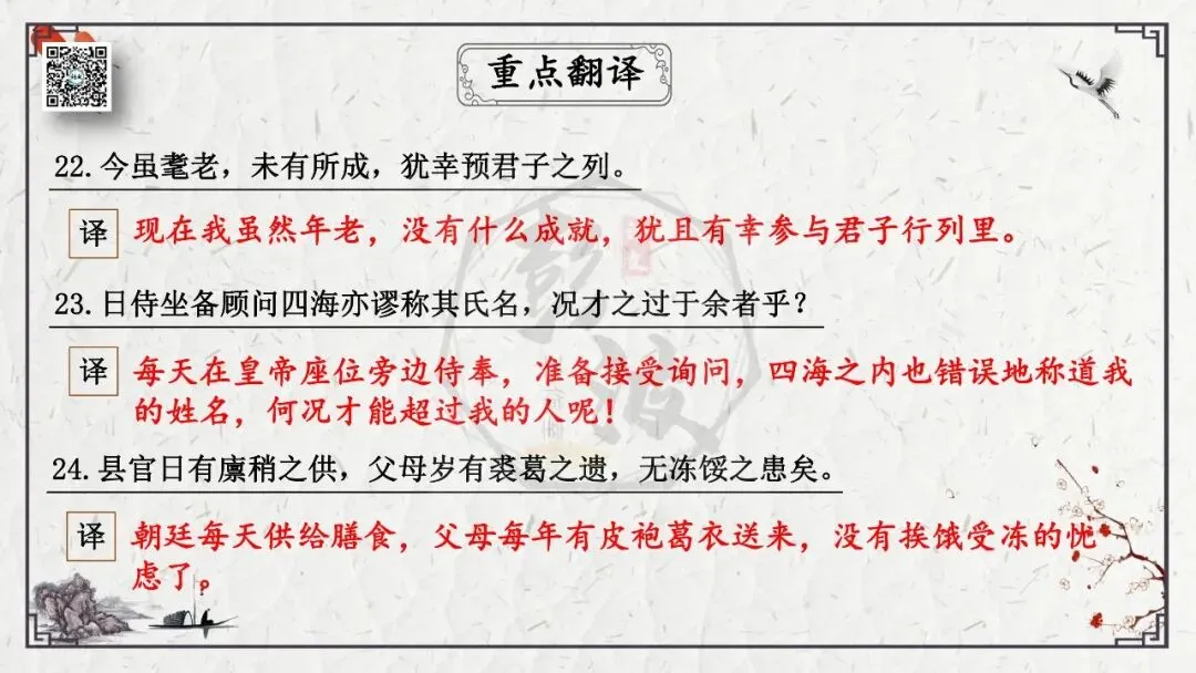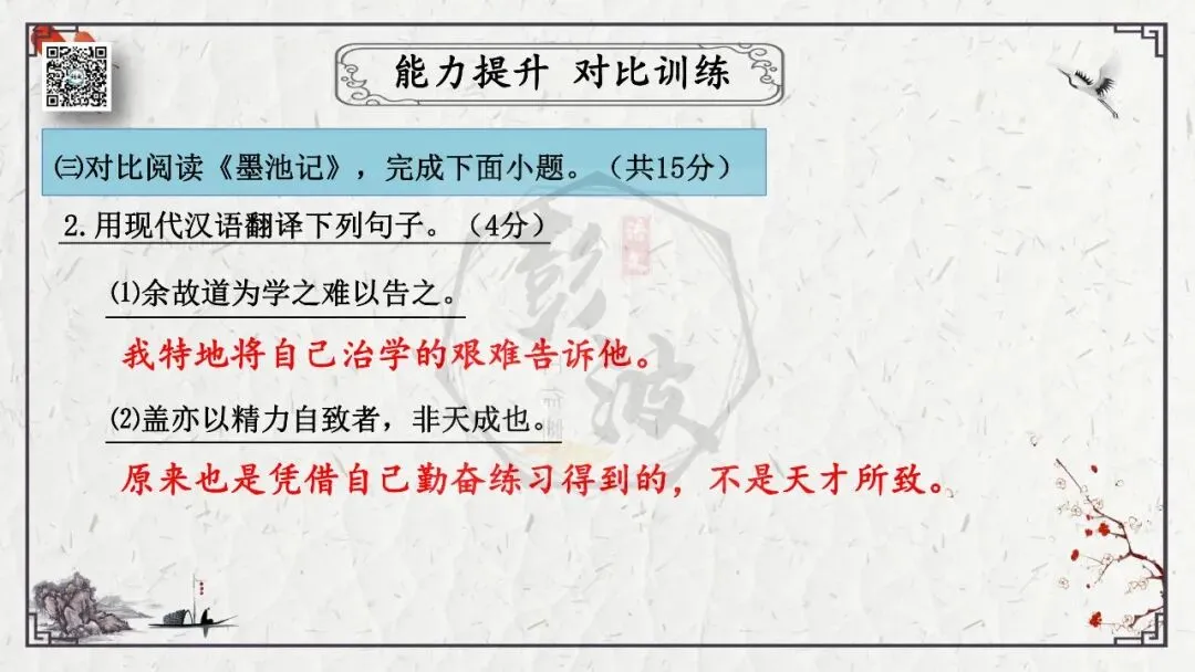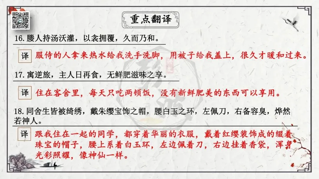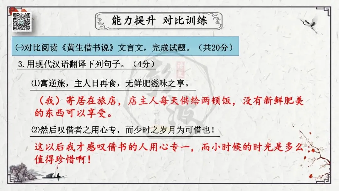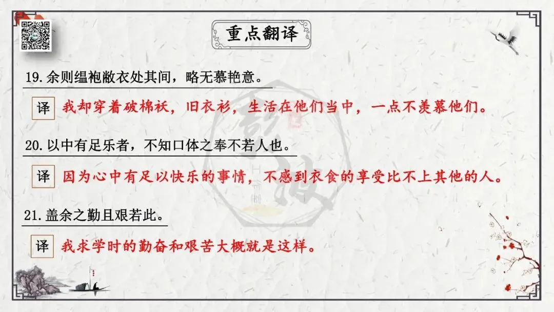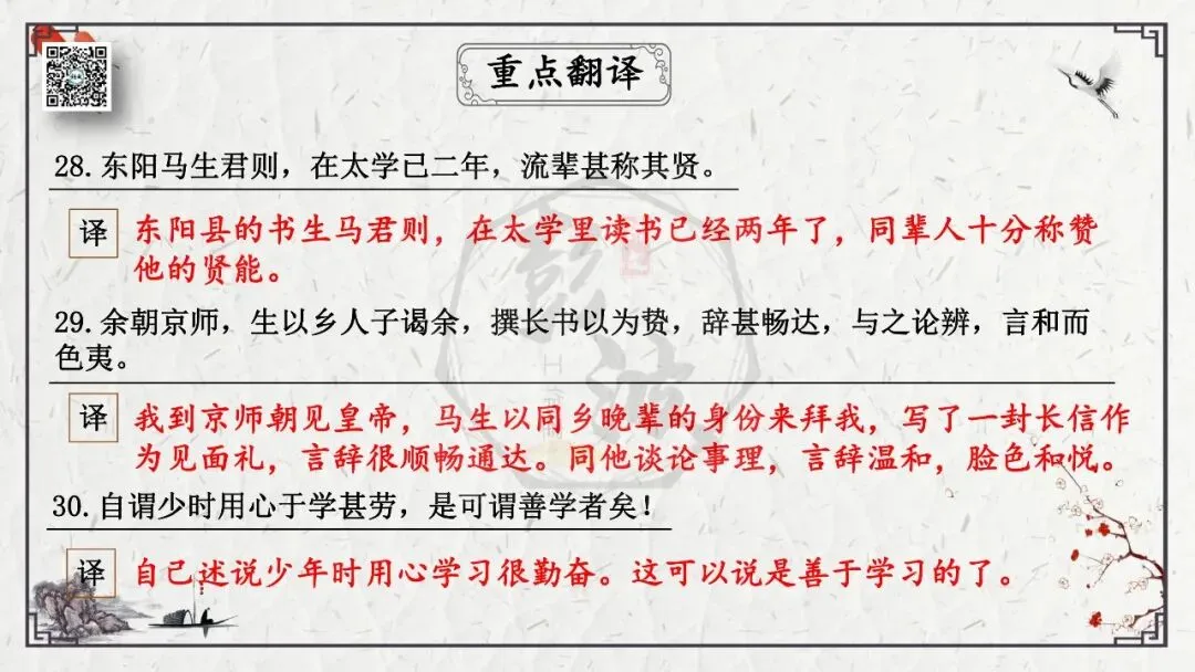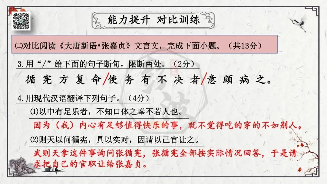 解读:①注重积累文言实词和虚词的意义、用法,积累特殊句式等。如翻译句子就是对常见文言实词、虚词、句式、语气的辨析,是识记、理解、分析的综合运用。②在理解词句的基础上,能概括出文章内容,能够对文意进行简单地分析,弄清作者抒发的感情或表达的观点,并能从中获得自己的独特感悟。