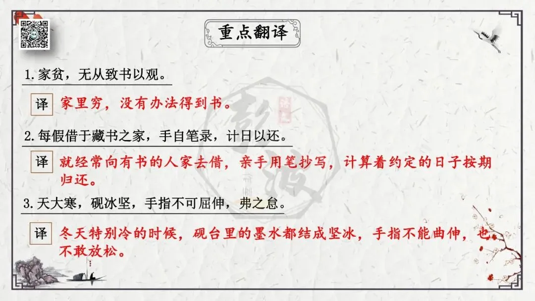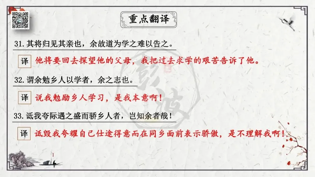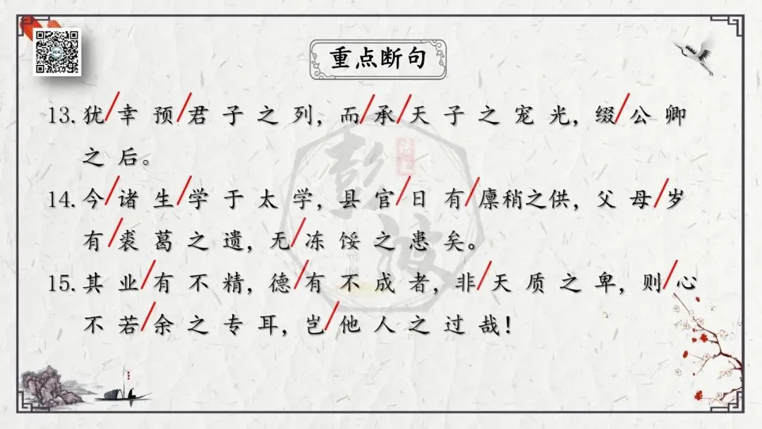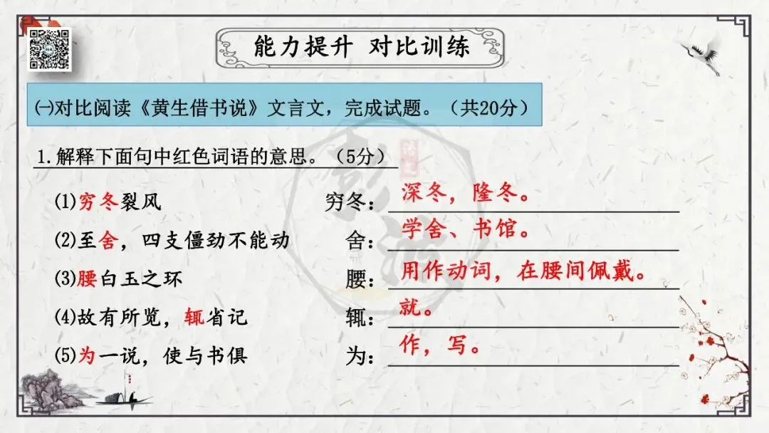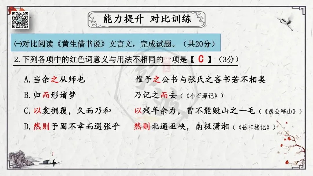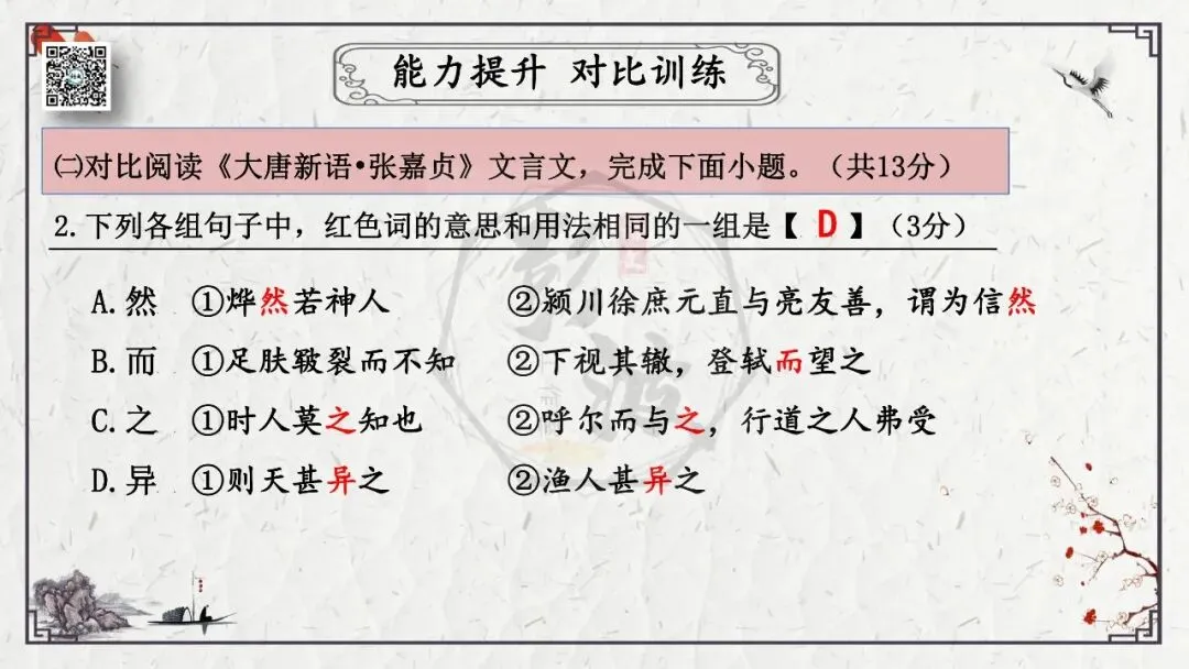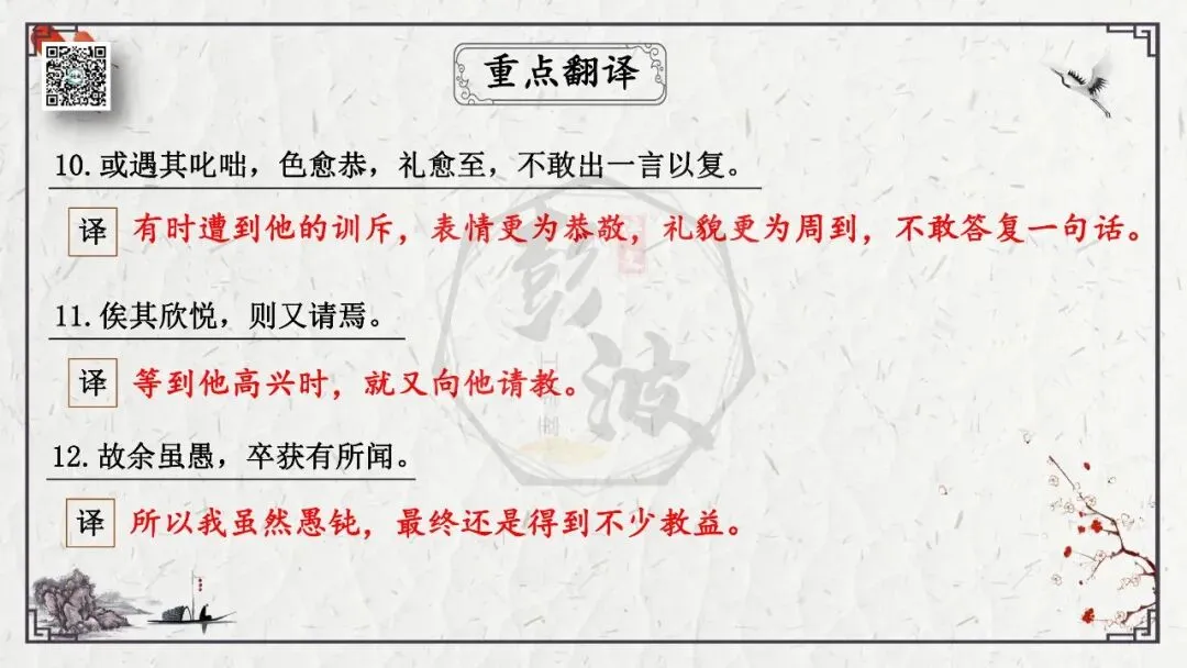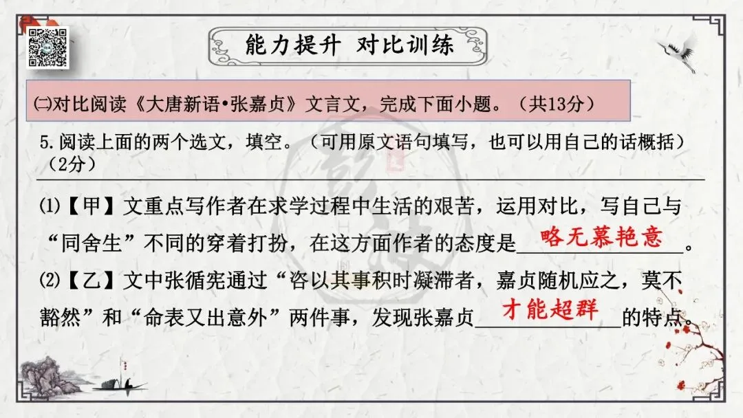 解读:①注重积累文言实词和虚词的意义、用法,积累特殊句式等。如翻译句子就是对常见文言实词、虚词、句式、语气的辨析,是识记、理解、分析的综合运用。②在理解词句的基础上,能概括出文章内容,能够对文意进行简单地分析,弄清作者抒发的感情或表达的观点,并能从中获得自己的独特感悟。