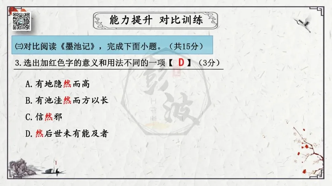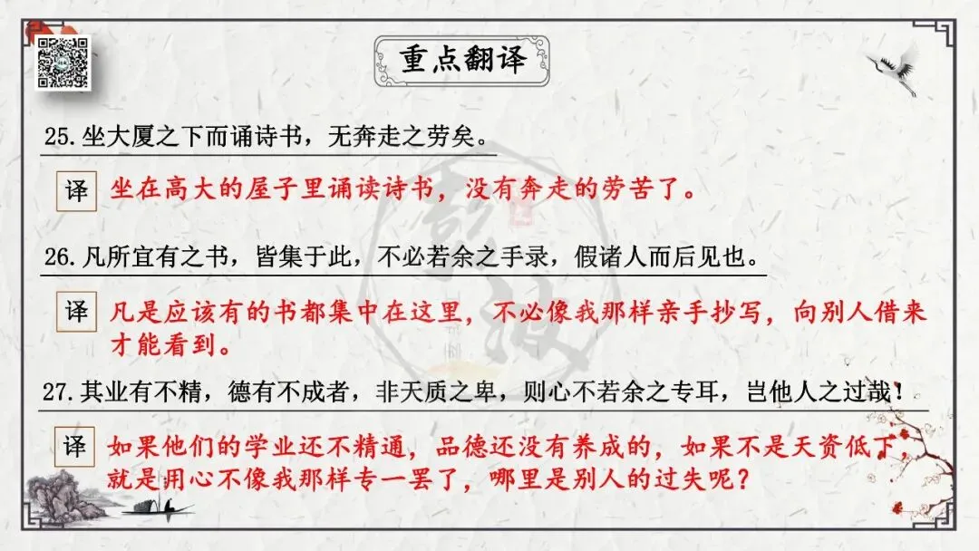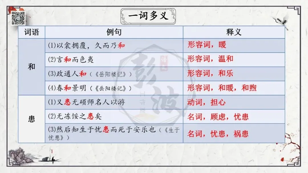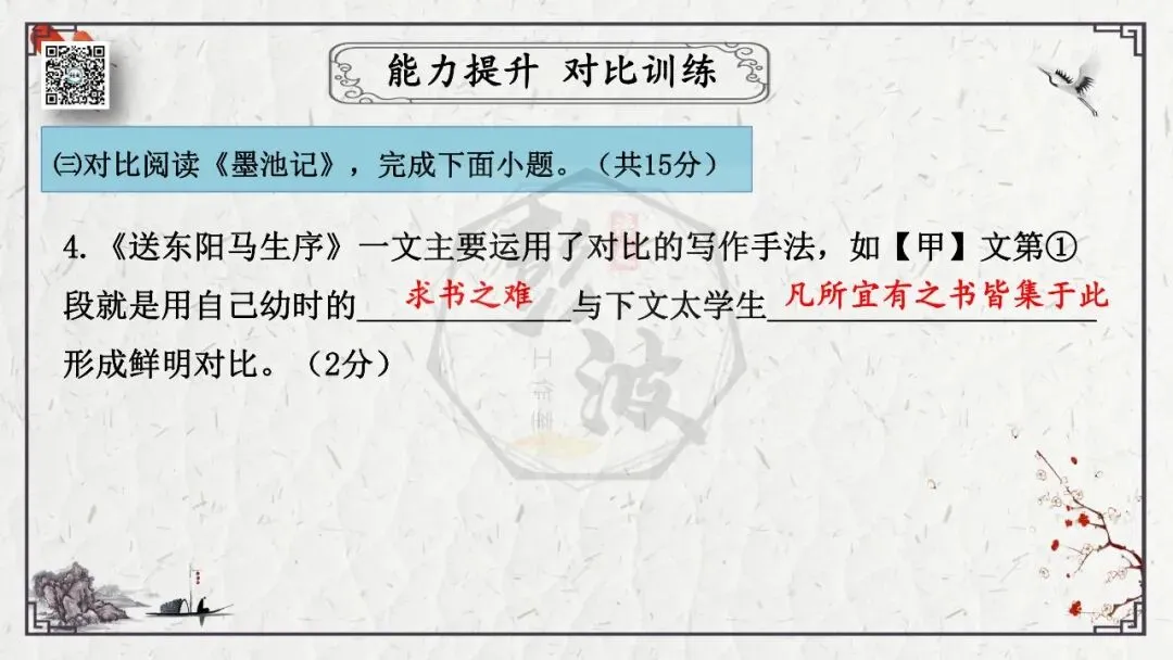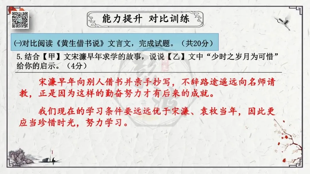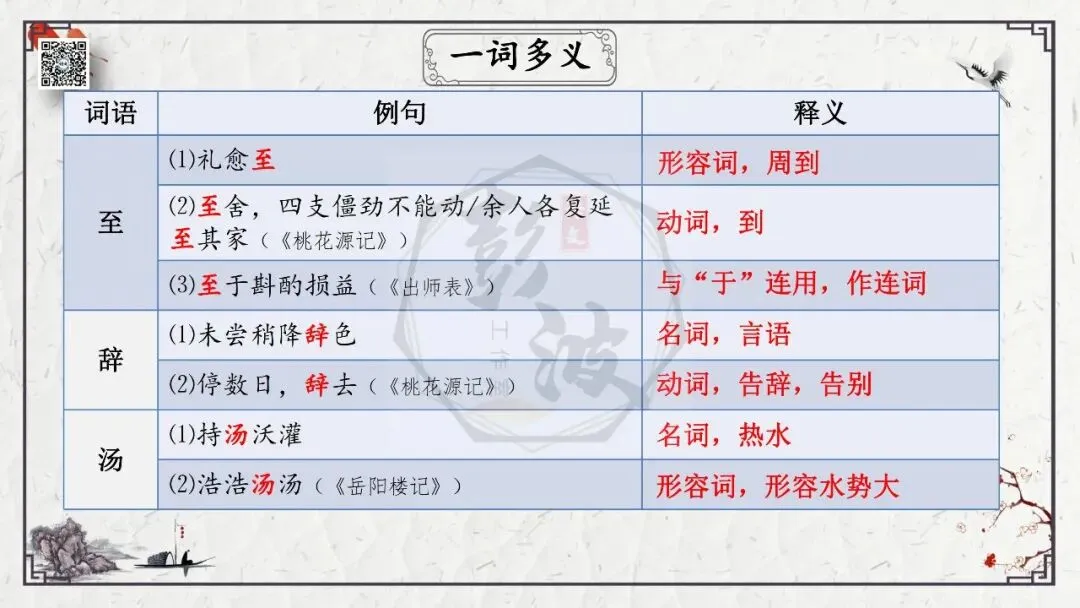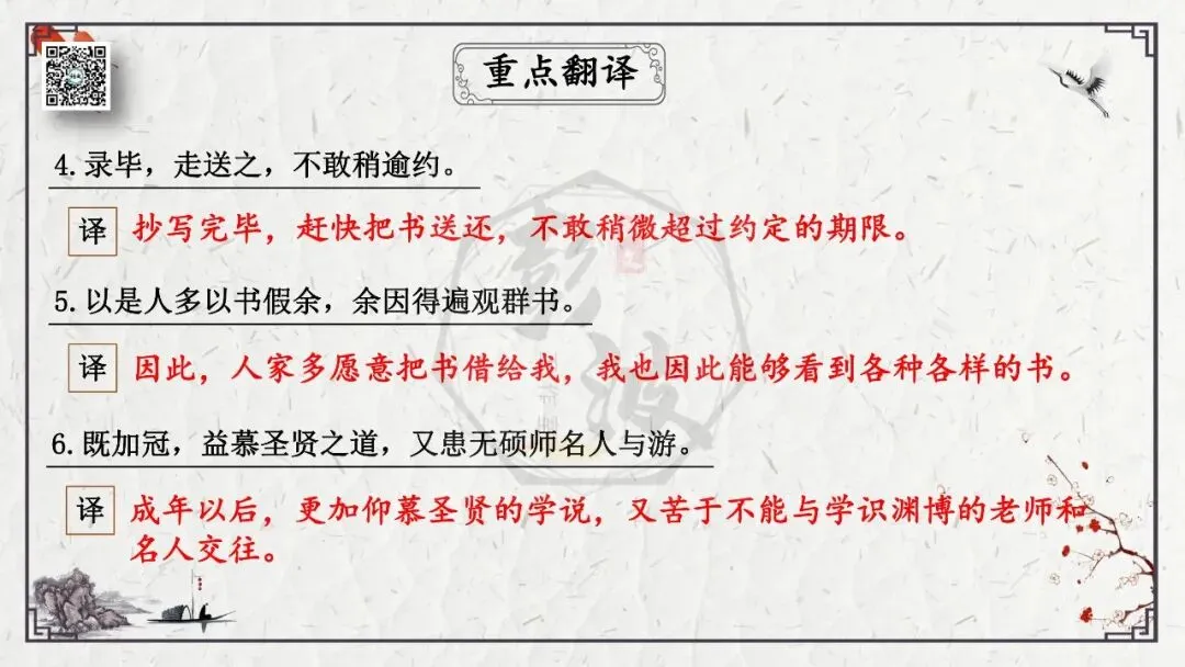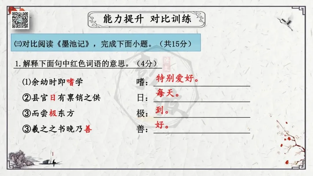 解读:①注重积累文言实词和虚词的意义、用法,积累特殊句式等。如翻译句子就是对常见文言实词、虚词、句式、语气的辨析,是识记、理解、分析的综合运用。②在理解词句的基础上,能概括出文章内容,能够对文意进行简单地分析,弄清作者抒发的感情或表达的观点,并能从中获得自己的独特感悟。