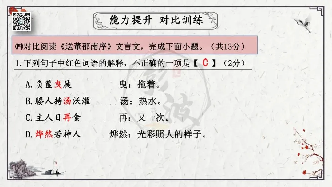 对应考查点:①积累字词、句式等,翻译句子。②理解鉴赏文本。