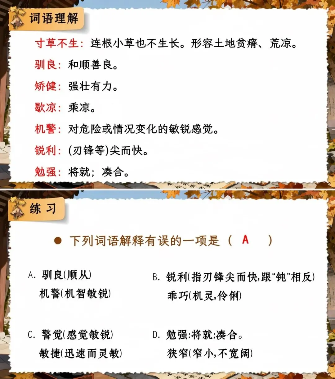 1.掌握易错字、多音字,理解 “寸草不生” 等词语,正确搭配词语。