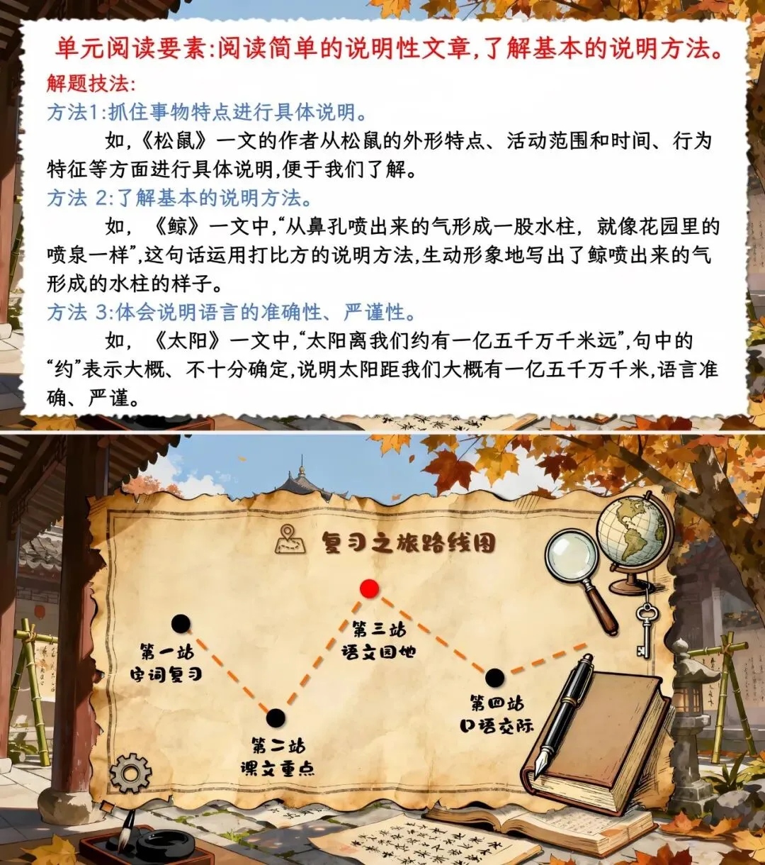 师:同学们,本单元我们走进了说明文的世界,认识了遥远的太阳和可爱的松鼠!今天咱们化身 “说明文探秘者”,开启 4 个 “探秘关卡”,每解锁一个关卡,就能获得一枚 “智慧勋章”,最终集齐勋章可兑换 “说明小达人” 称号!大家准备好了吗?首先,咱们进入第一关:字词基础关!