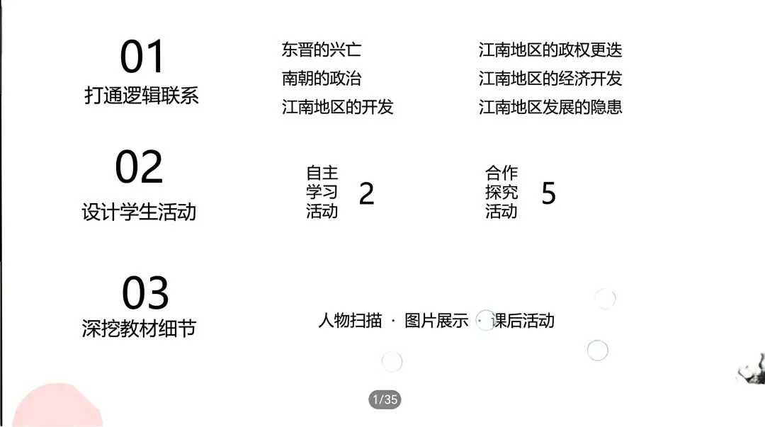 因此,我在备课时对本课内容进行了重组融合,梳理出三个关键内容:江南地区的政权更迭、江南地区的经济开发、江南地区发展的隐患。依据课标要求,为落实核心素养、发挥学生主体作用,我将本课中相对容易的部分设计成两项学生自主学习活动,将需要学生探究思考的内容设计成五项合作探究活动,同时把教材中的人物扫描、文物图片、课后活动等内容充分运用起来。