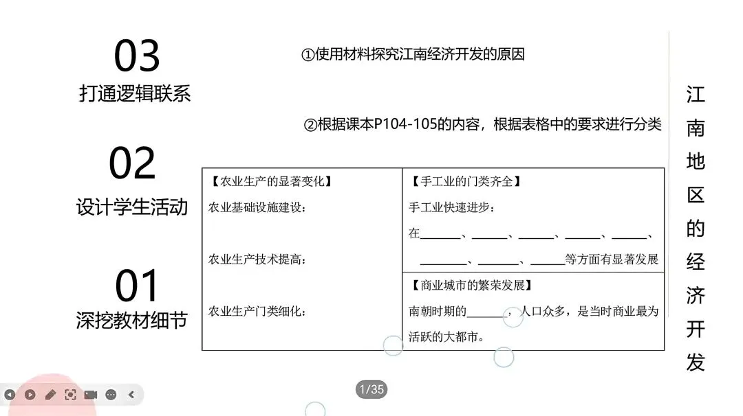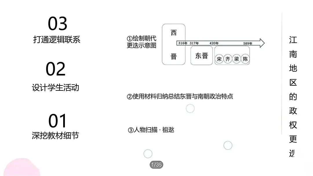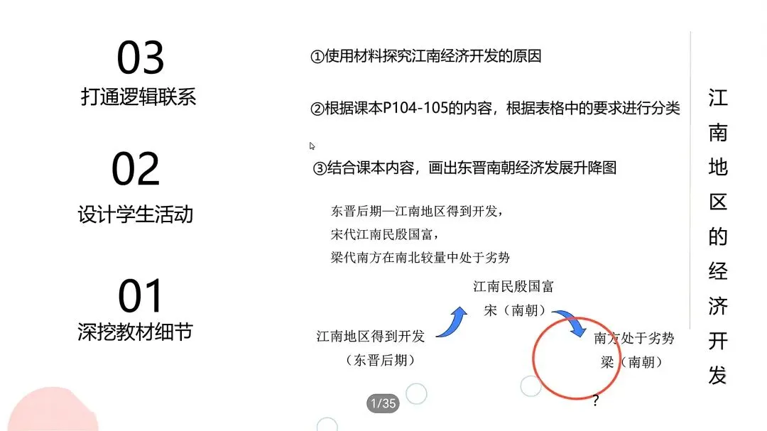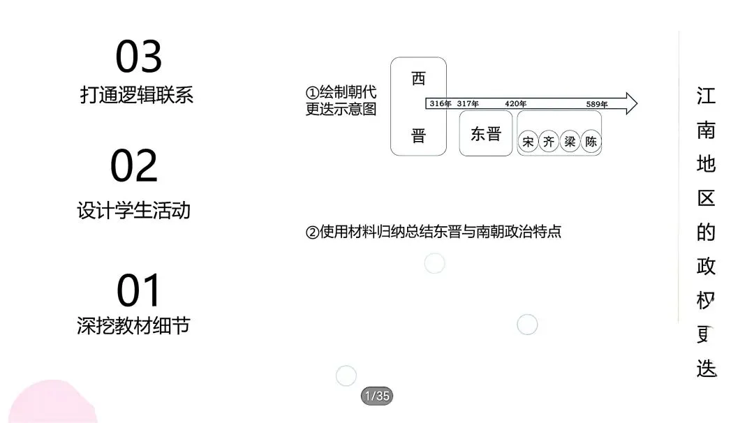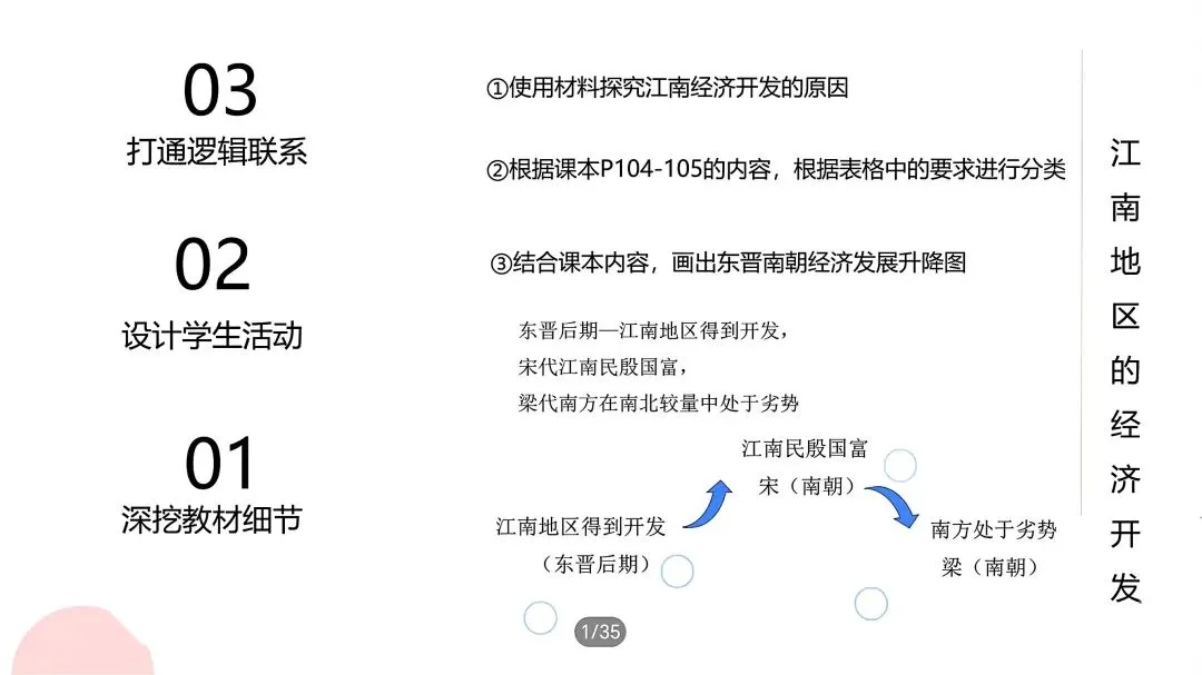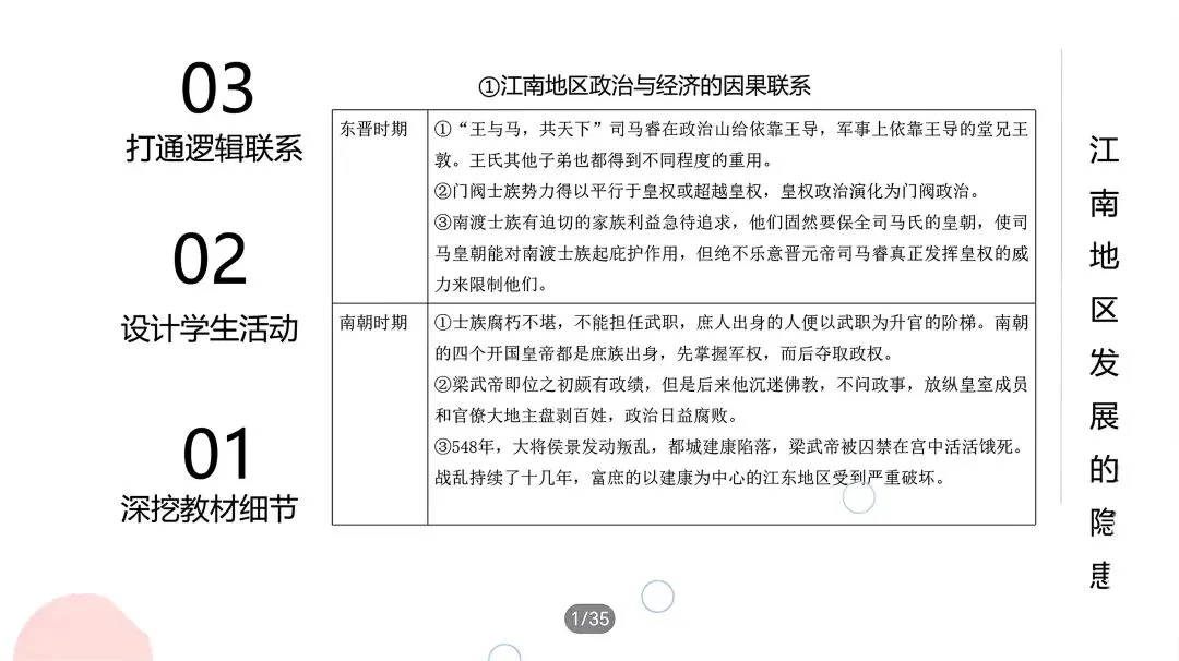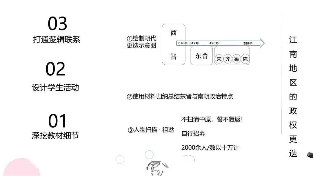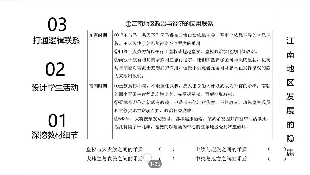 教材中,本课共有三个子目:东晋的兴亡、南朝的政治和江南地区的开发。这三个子目之间既有时序联系,又有内容交叉。但在实际教学中,若将东晋、南朝的政治与经济分别陈述,容易使学生在学习时将二者割裂记忆,不利于学生对东晋南朝时期江南地区的发展情况形成整体认知,也容易忽视政治、制度与经济发展之间的内在联系。