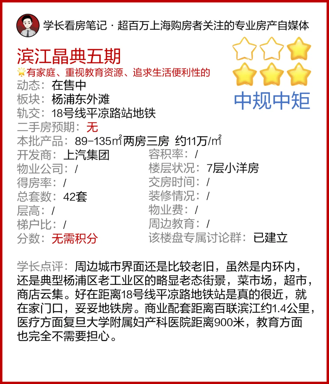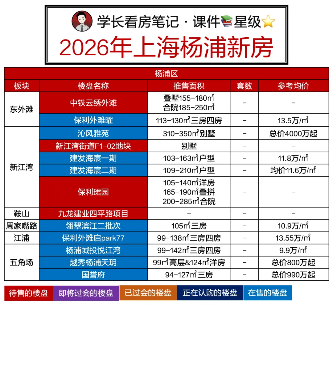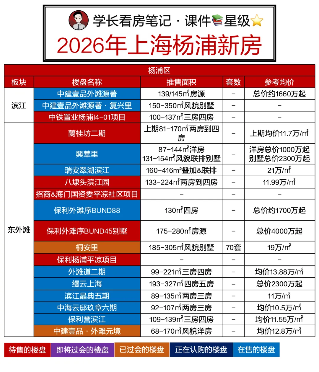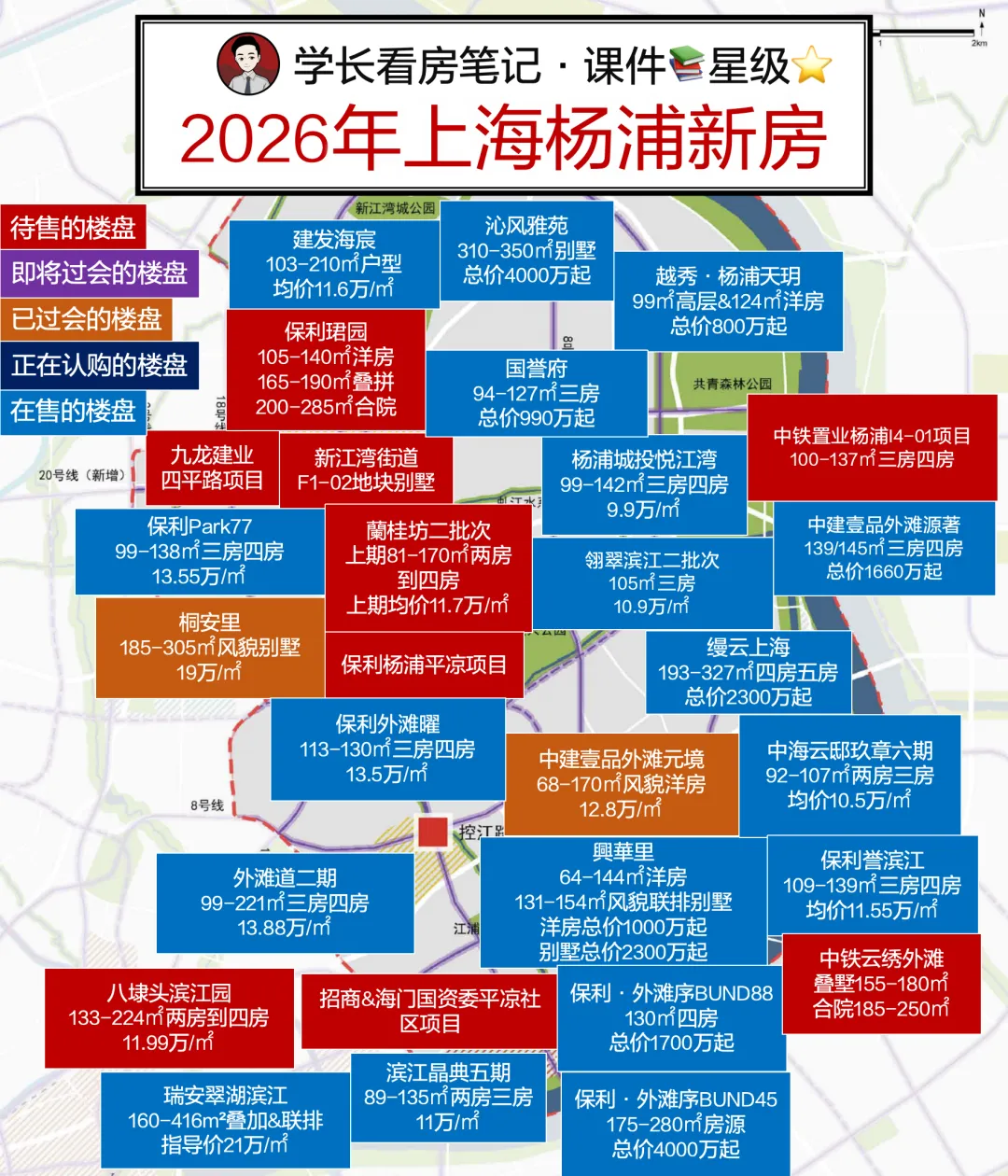 最新消息,杨浦「中铁云绣外滩」规划设计方案公示!预计叠墅建面约155-180㎡,合院建面约185-250㎡!最新消息,杨浦东外滩「保利外滩曜」在售中!建面约113-130㎡三房四房,均价13.5万/㎡!最新消息,杨浦新江湾「沁风雅苑」正在热销中!推出建面约310-350㎡精装修叠墅,均价约12万/㎡!最新消息,户型图过程稿曝光!靠近10号线新江湾城站「保利珺园」即将入市!将推约105-140㎡洋房&165-190㎡叠拼&200-285㎡合院!最新消息,「新江湾街道F1-02地块」目前项目的规划设计方案已经公示,拟建一座4层住宅及一层地下室,容积率1.0。该项目的体量较小,住宅建面约900㎡,可能为3套别墅,供应量极低。最新消息,500米地铁旁「建发海宸」二期正在热销中!推出建面约109-210㎡房源!欲了解详情可点击: