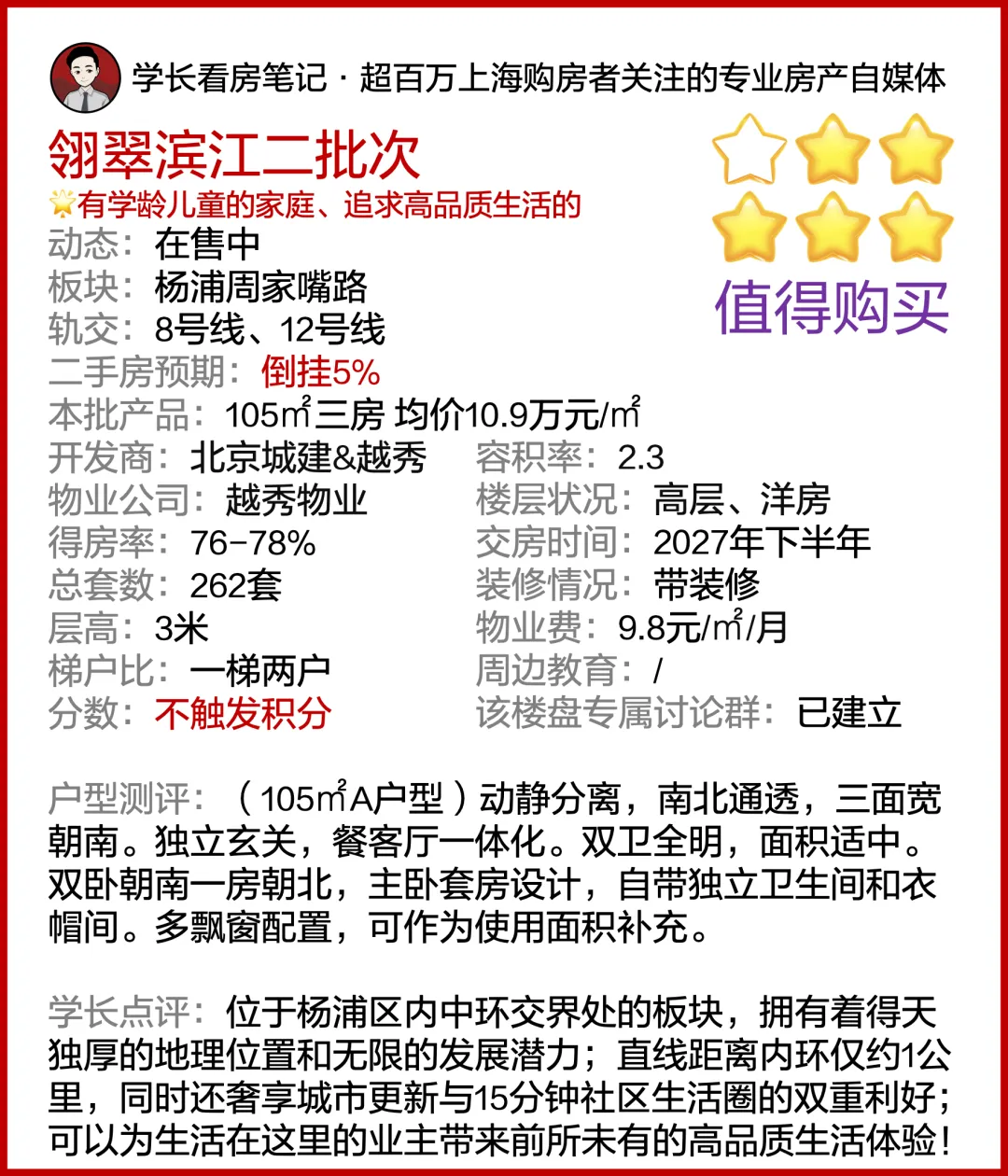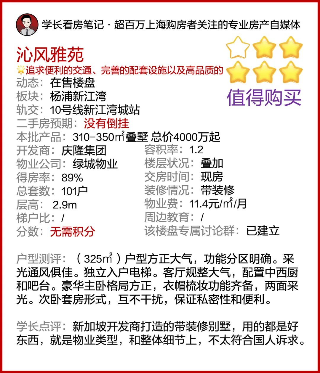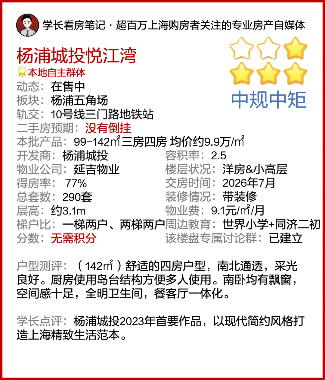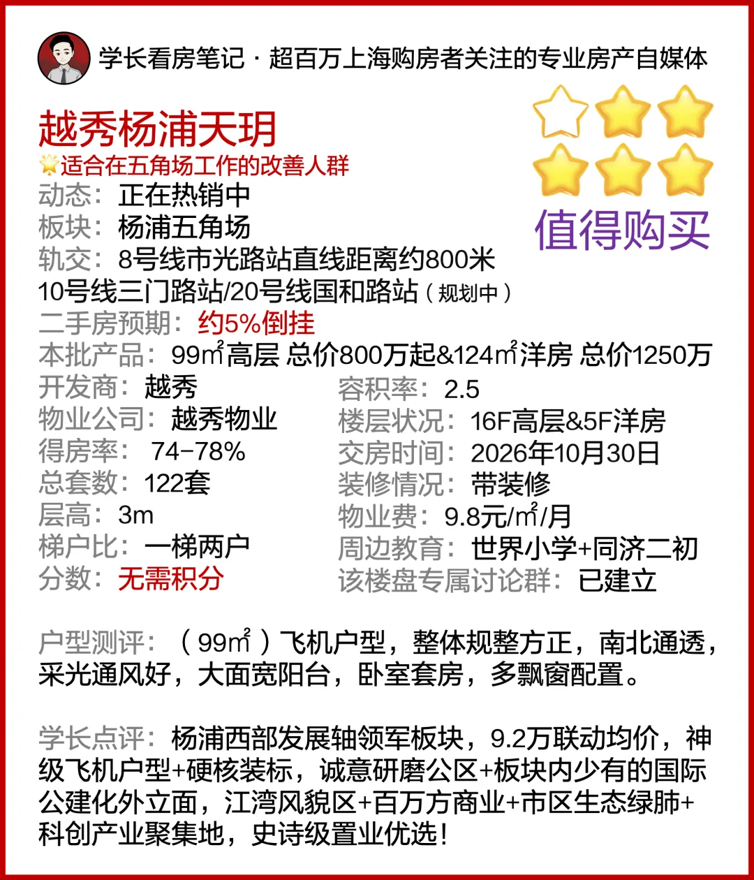 最新消息,杨浦「中铁云绣外滩」规划设计方案公示!预计叠墅建面约155-180㎡,合院建面约185-250㎡!最新消息,杨浦东外滩「保利外滩曜」在售中!建面约113-130㎡三房四房,均价13.5万/㎡!最新消息,杨浦新江湾「沁风雅苑」正在热销中!推出建面约310-350㎡精装修叠墅,均价约12万/㎡!最新消息,户型图过程稿曝光!靠近10号线新江湾城站「保利珺园」即将入市!将推约105-140㎡洋房&165-190㎡叠拼&200-285㎡合院!最新消息,「新江湾街道F1-02地块」目前项目的规划设计方案已经公示,拟建一座4层住宅及一层地下室,容积率1.0。该项目的体量较小,住宅建面约900㎡,可能为3套别墅,供应量极低。最新消息,500米地铁旁「建发海宸」二期正在热销中!推出建面约109-210㎡房源!欲了解详情可点击: