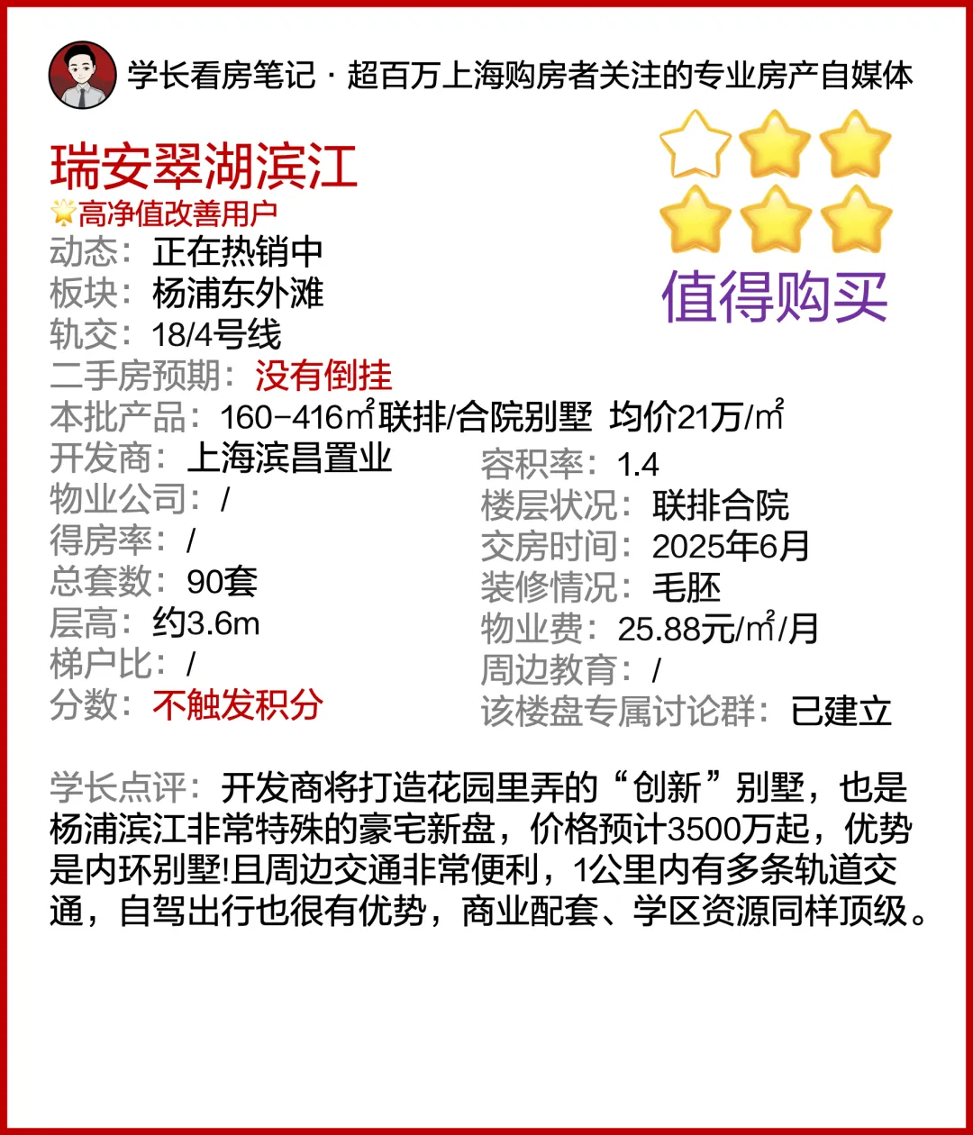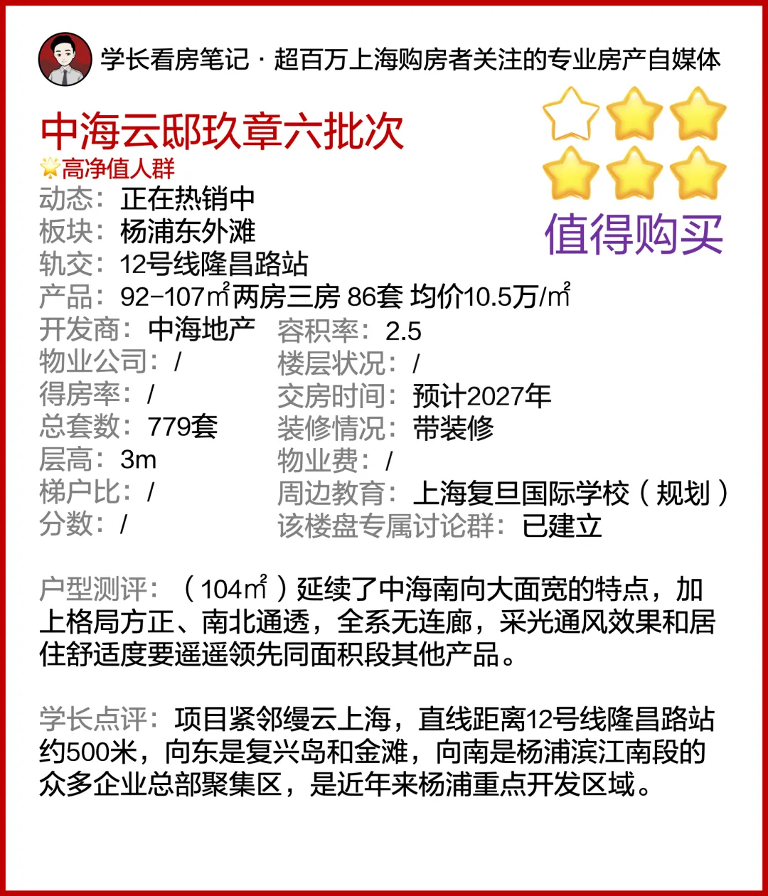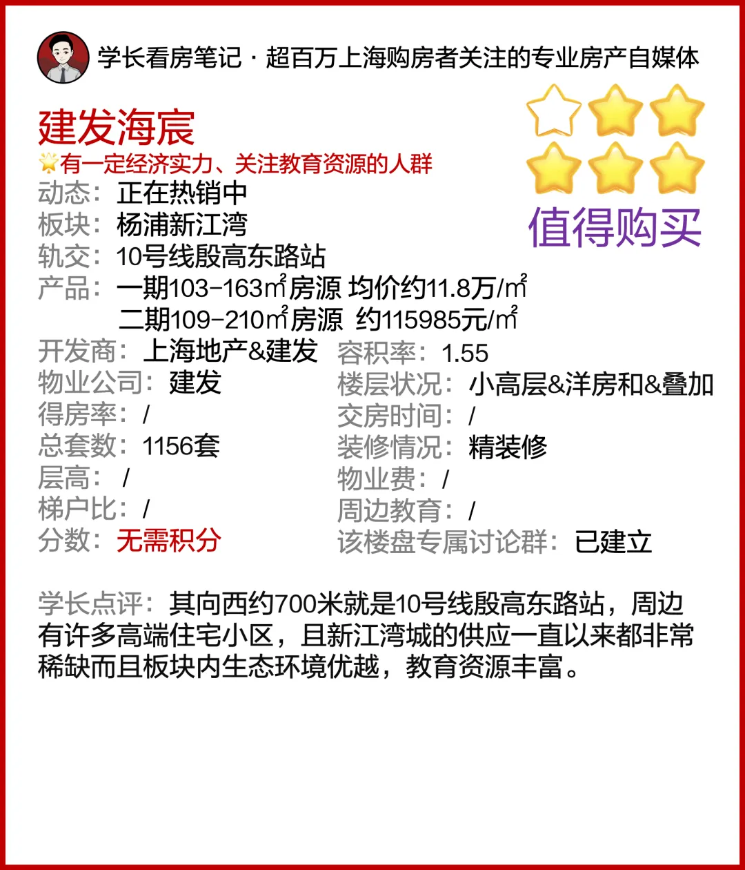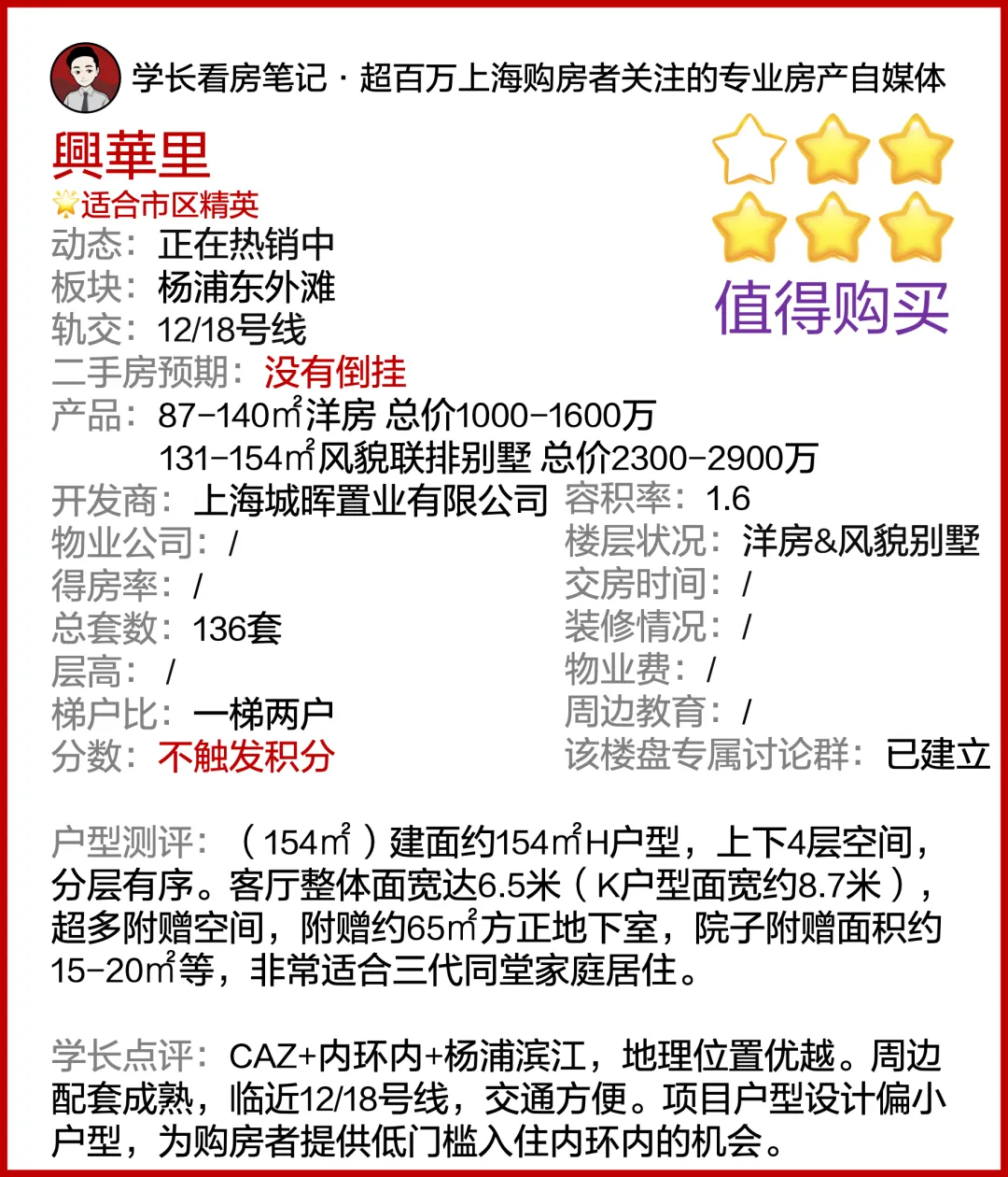 最新消息,杨浦「中铁云绣外滩」规划设计方案公示!预计叠墅建面约155-180㎡,合院建面约185-250㎡!最新消息,杨浦东外滩「保利外滩曜」在售中!建面约113-130㎡三房四房,均价13.5万/㎡!最新消息,杨浦新江湾「沁风雅苑」正在热销中!推出建面约310-350㎡精装修叠墅,均价约12万/㎡!最新消息,户型图过程稿曝光!靠近10号线新江湾城站「保利珺园」即将入市!将推约105-140㎡洋房&165-190㎡叠拼&200-285㎡合院!最新消息,「新江湾街道F1-02地块」目前项目的规划设计方案已经公示,拟建一座4层住宅及一层地下室,容积率1.0。该项目的体量较小,住宅建面约900㎡,可能为3套别墅,供应量极低。最新消息,500米地铁旁「建发海宸」二期正在热销中!推出建面约109-210㎡房源!欲了解详情可点击: