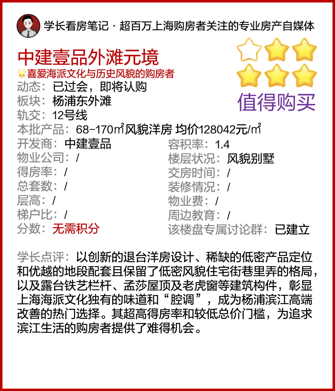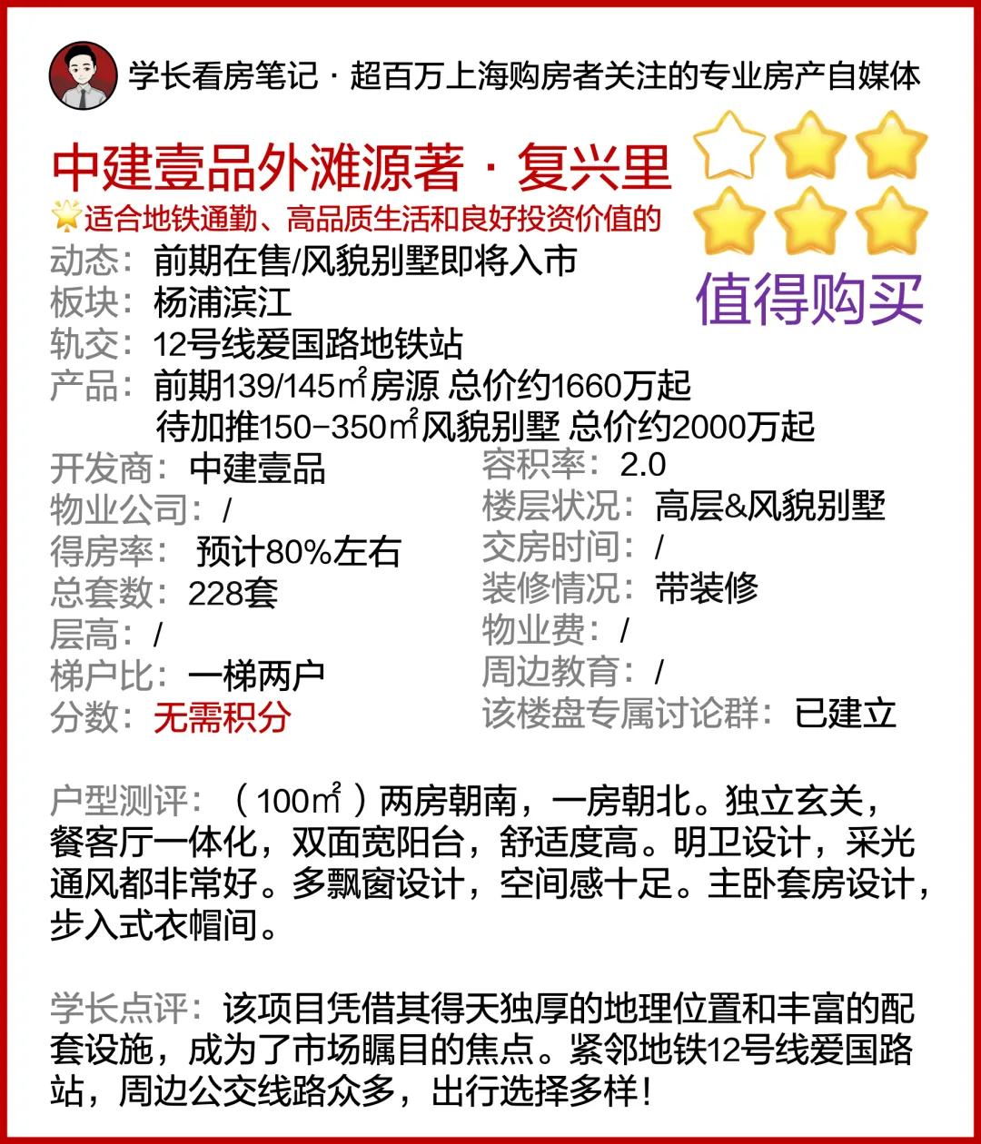 最新消息:杨浦滨江“卷王级”豪宅!「中建壹品外滩源著复兴里」即将入市!加推建面约150-350㎡别墅!欲了解详情可点击: