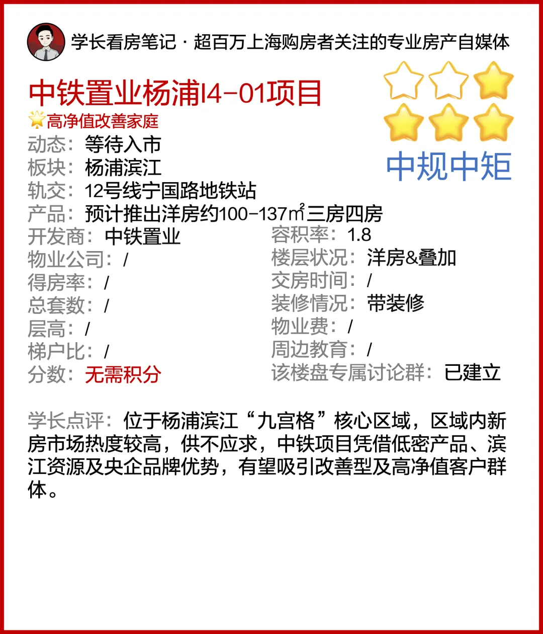 最新消息,杨浦「中铁置业杨浦I4-01项目」预计12月底开放展厅!预计推出洋房约100-137㎡三房四房!最新消息:杨浦东外滩「蘭桂坊」首开售罄,二批次即将加推!上期推出建筑面积约81-170㎡两房到四房!最新消息:上海2000万级的典藏版之作!内环CAZ+风貌别墅「興華里」在售中,机会稍纵即逝!最新消息:样板间视频发布!杨浦东外滩「瑞安·翠湖滨江」正在热销中!推售建面约160-416㎡联排/合院别墅,均价约21万/㎡!欲了解详情可点击: