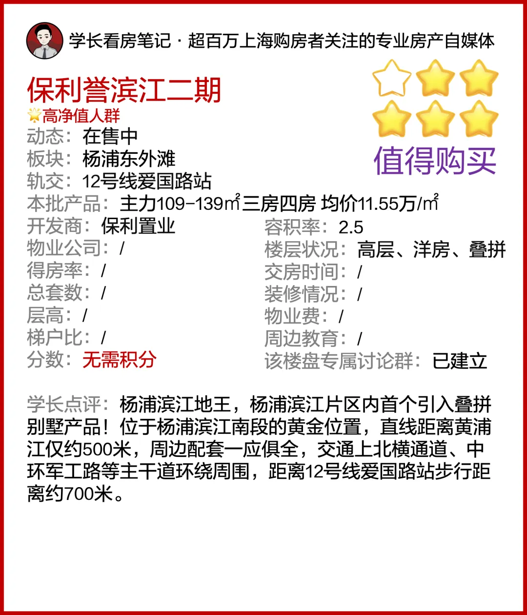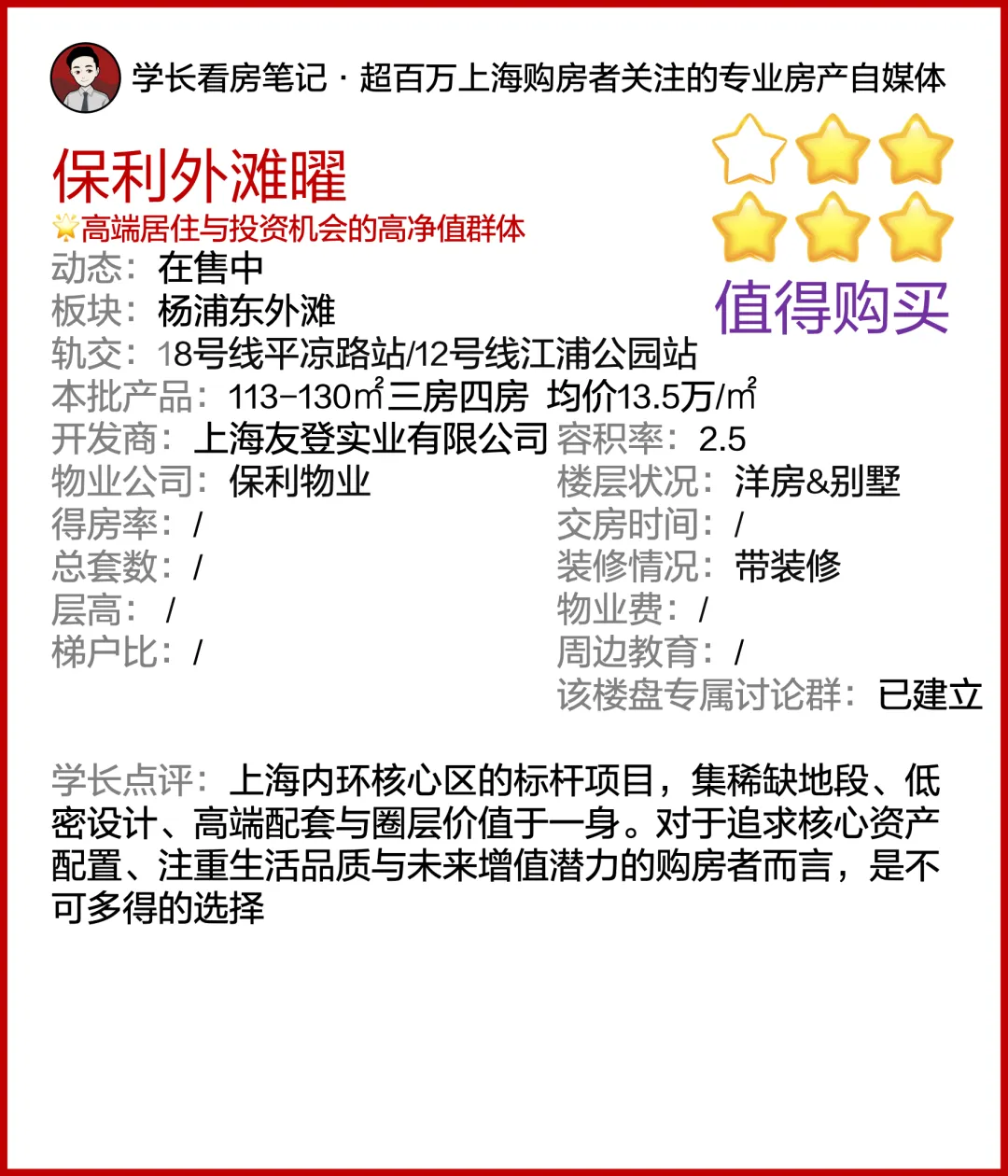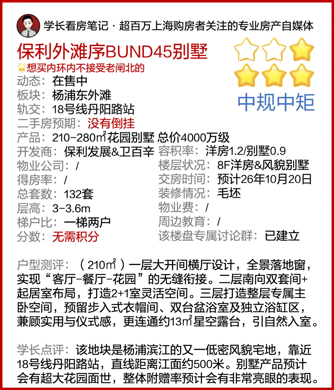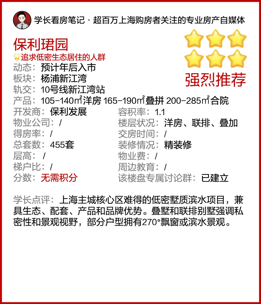 最新消息:4000万级内环花园别墅「保利外滩序BUND45」别墅在售中!建面约210-280㎡花园别墅!最新消息:杨浦东外滩「桐安里」已取证,即将认购!建面约185-305㎡风貌别墅,共计12套!最新消息:杨浦东外滩「招商平凉社区项目」等待入市!三幅住宅地块建筑面积相加约11.3万㎡,容积率为1.3或1.4!