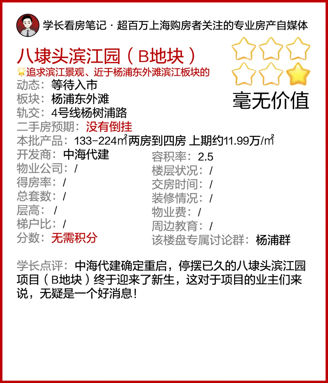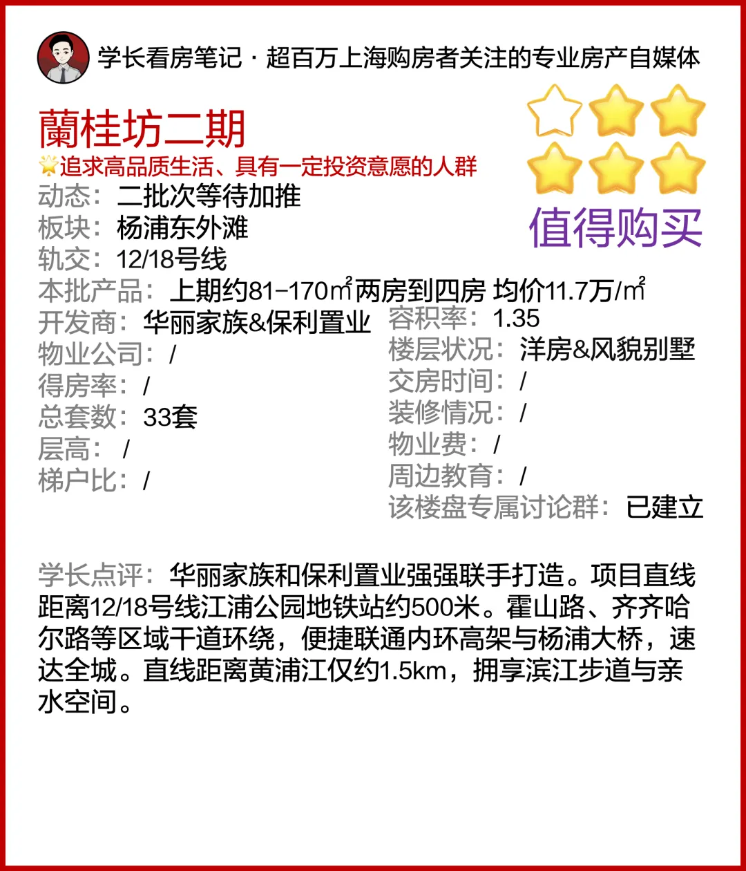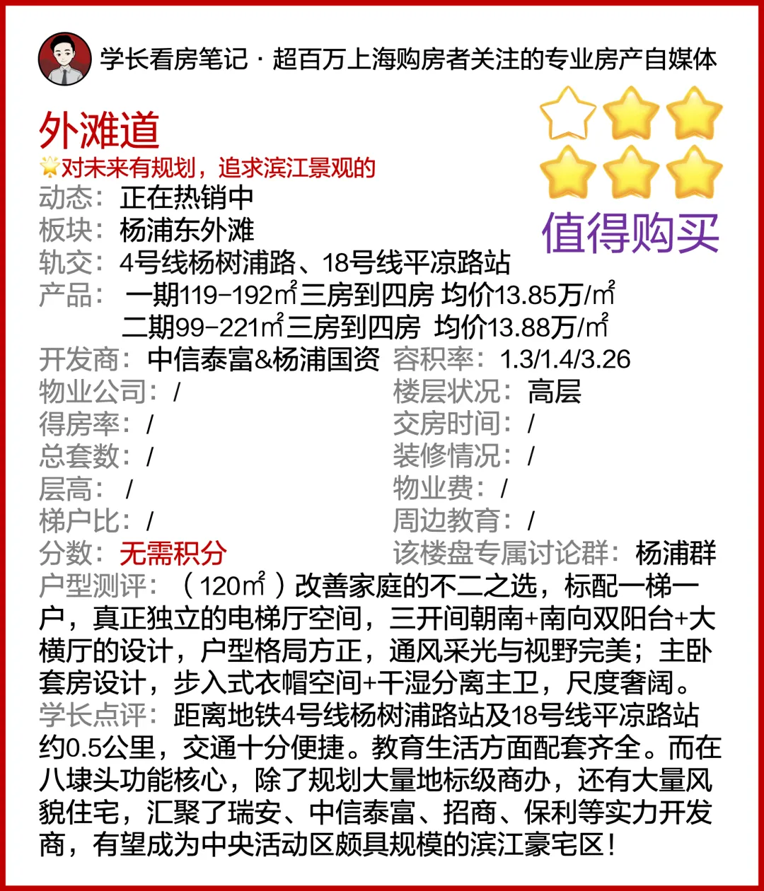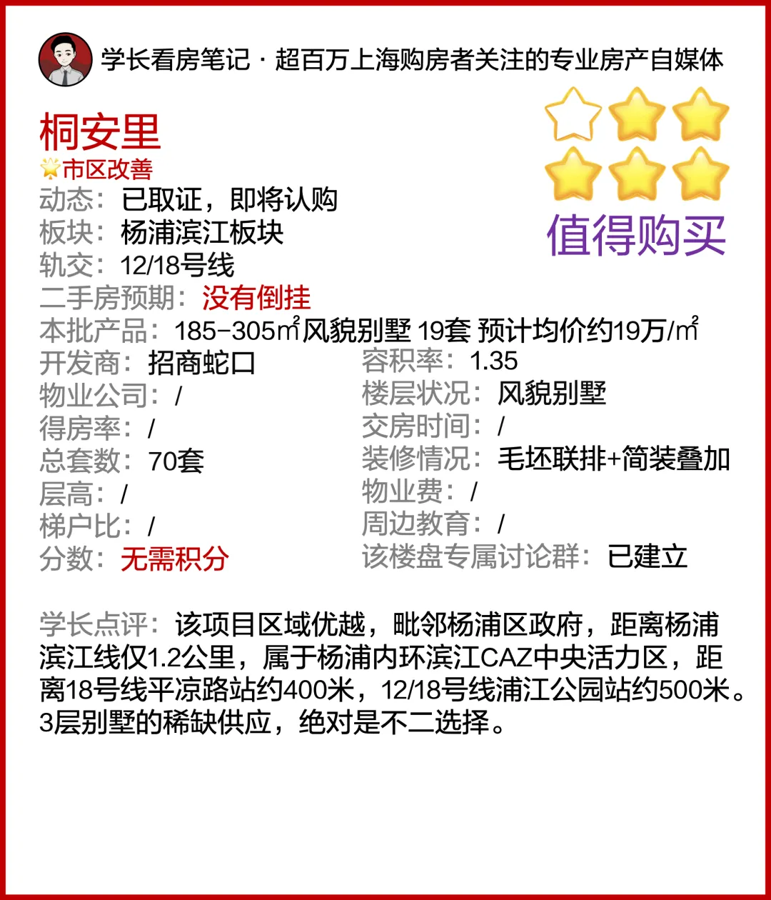 最新消息:4000万级内环花园别墅「保利外滩序BUND45」别墅在售中!建面约210-280㎡花园别墅!最新消息:杨浦东外滩「桐安里」已取证,即将认购!建面约185-305㎡风貌别墅,共计12套!最新消息:杨浦东外滩「招商平凉社区项目」等待入市!三幅住宅地块建筑面积相加约11.3万㎡,容积率为1.3或1.4!
