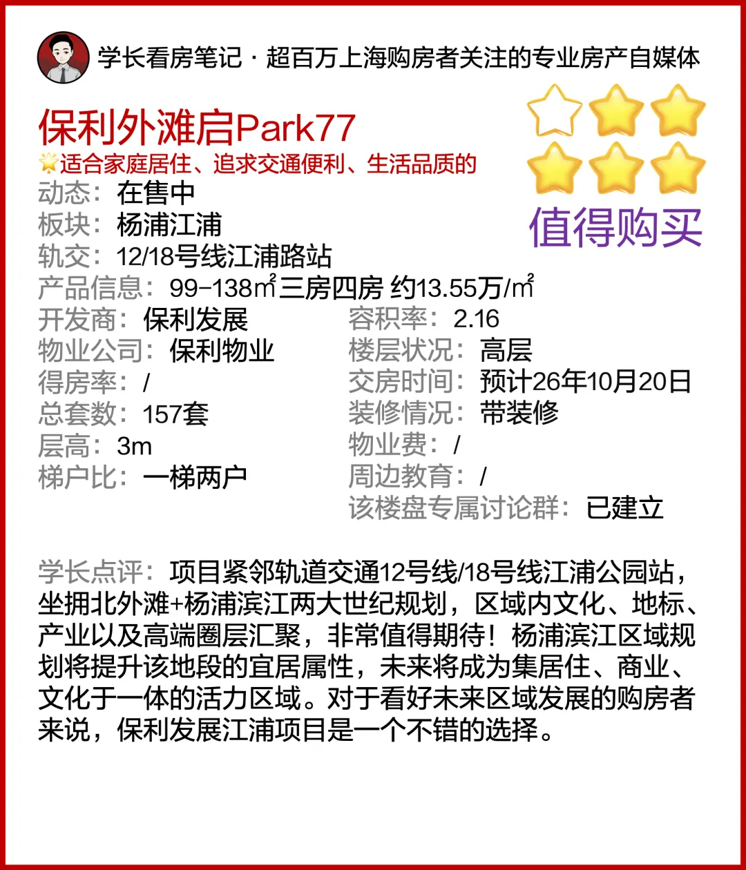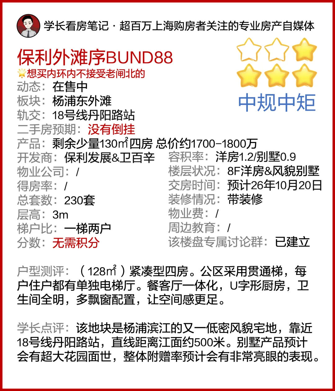 最新消息:杨浦「保利·外滩序BUND88」剩余少量建面约130㎡四房在售,总价约1700万起!