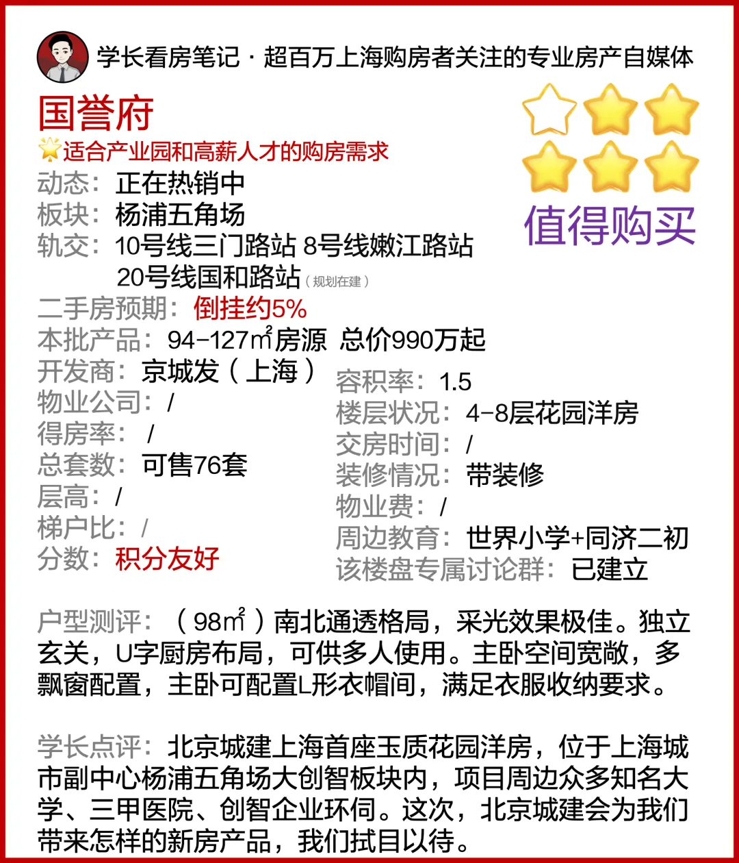 最新消息,杨浦内中环「国誉府」正在热销中!推出建面约94-127㎡房源,总价约990-1800万!欲了解详情可点击: