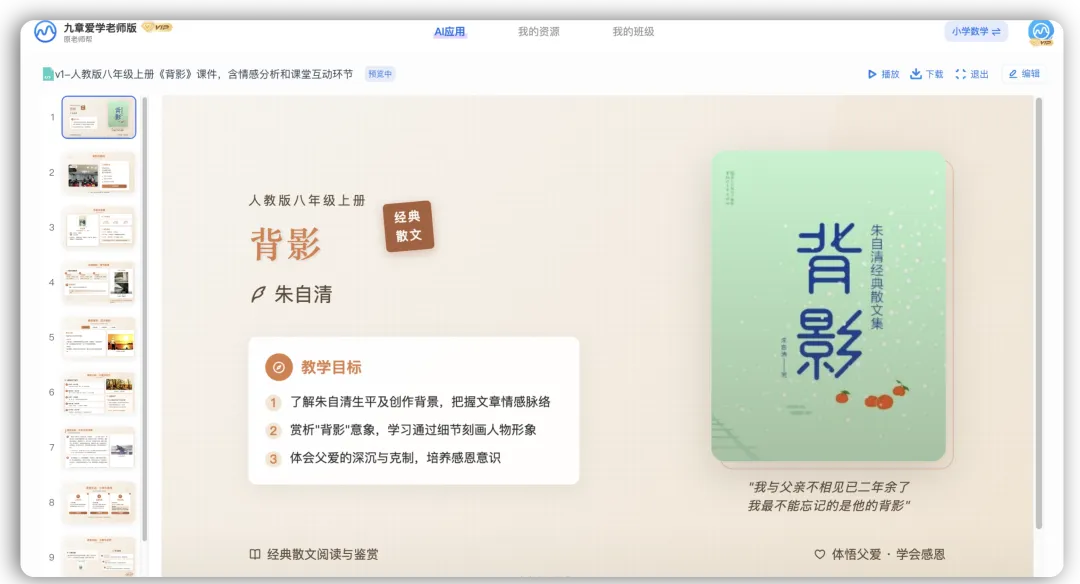 “备课两小时,排版大半天”,这是无数老师们的日常困境。搜集素材、梳理框架、设计版式、添加互动环节,繁琐的流程耗尽了本该用来打磨教学内容的精力。如今,九章爱学老师版推出重磅黑科技-- 「AI完整课件」功能,帮助老师们实现「一句话生成完整教学课件」打破传统备课壁垒,让AI成为你的专属备课助教,所有课文内容、知识点,只需一句话,就能快速生成结构完整、风格专业、适配学情的教学课件,把时间还给教学本身。不同于普通AI工具的“碎片化辅助”,九章爱学老师版新功能精准适配教育场景,从内容生成到视觉美化实现全链路智能化,真正做到“输入即所得”目前该功能在网页版免费开放(www.laoshibang.com),无需复杂操作,无需专业设计能力,你只需随口一句需求,就能快速生成符合教学标准的完整互动课件:- 语文老师:“生成人教版八年级上册《背影》课件,含情感分析和课堂互动环节”——几分钟内获得含作者背景、段落解析、意象赏析、小组讨论话题的完整课件,配图自动匹配文本意境;