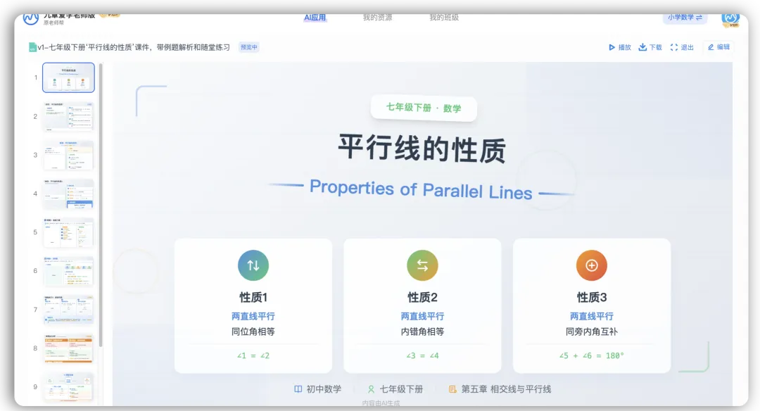 - 数学老师:“制作七年级下册‘平行线的性质’课件,带例题解析和随堂练习”——系统自动梳理知识点框架,生成公式推导步骤、典型例题、易错点提醒,甚至能智能插入辅助图示;